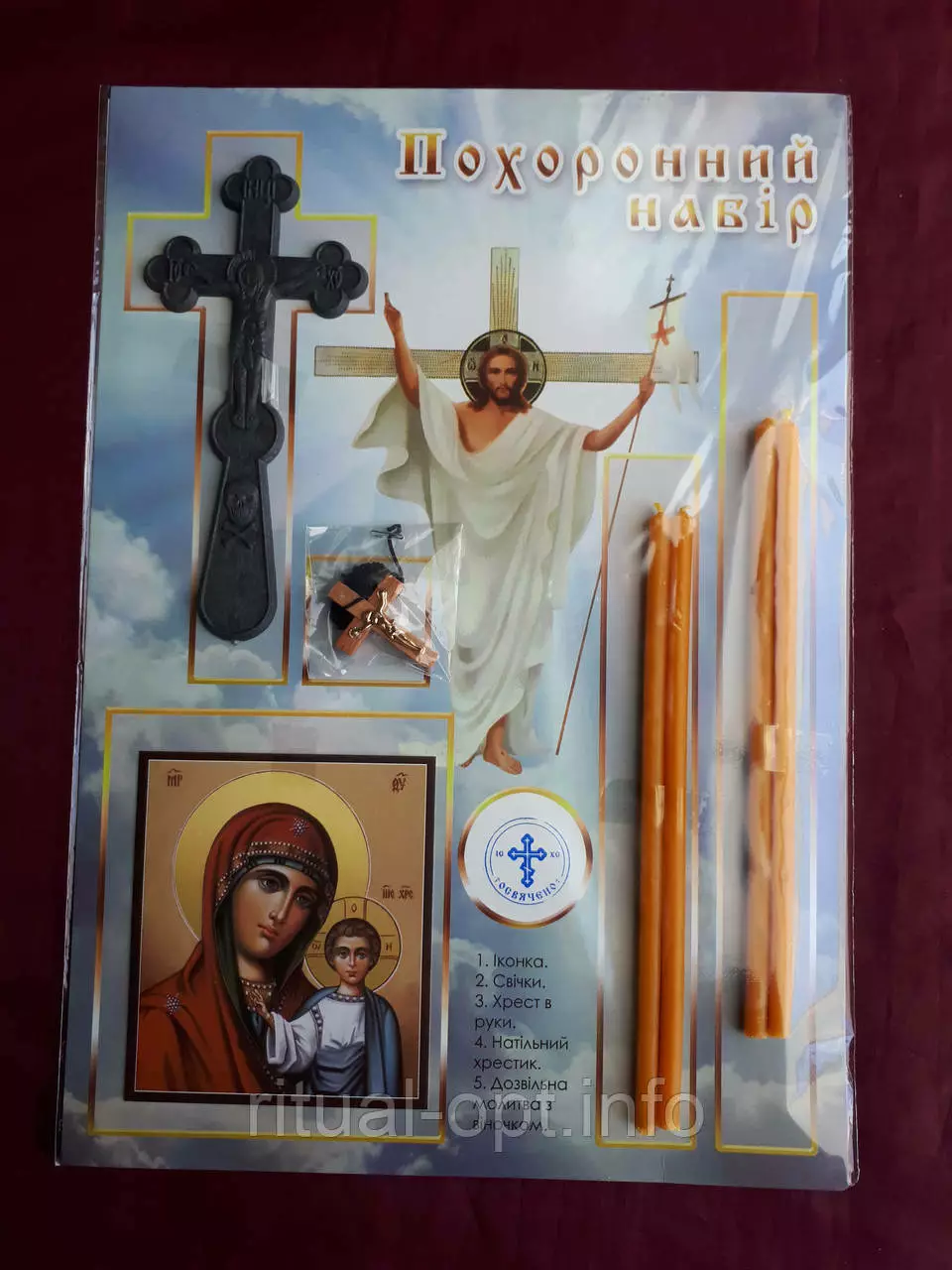 В набір входить : іконка,4 свічки,хрестик натільний хрест у руки,молитва.Виробник Україна.