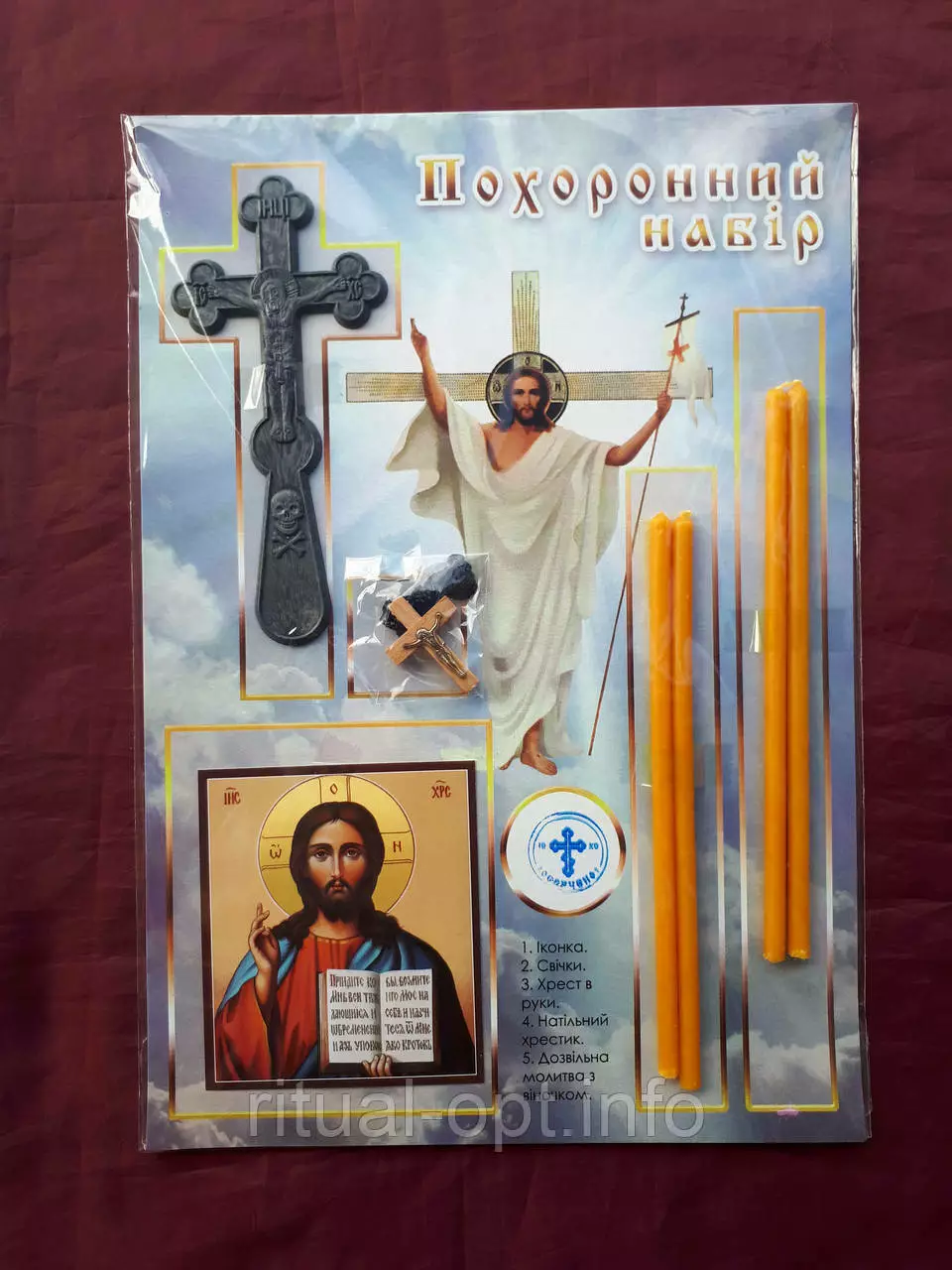 В набір входить : іконка,4 свічки,хрестик натільний хрест у руки,молитва. Виробник Україна.