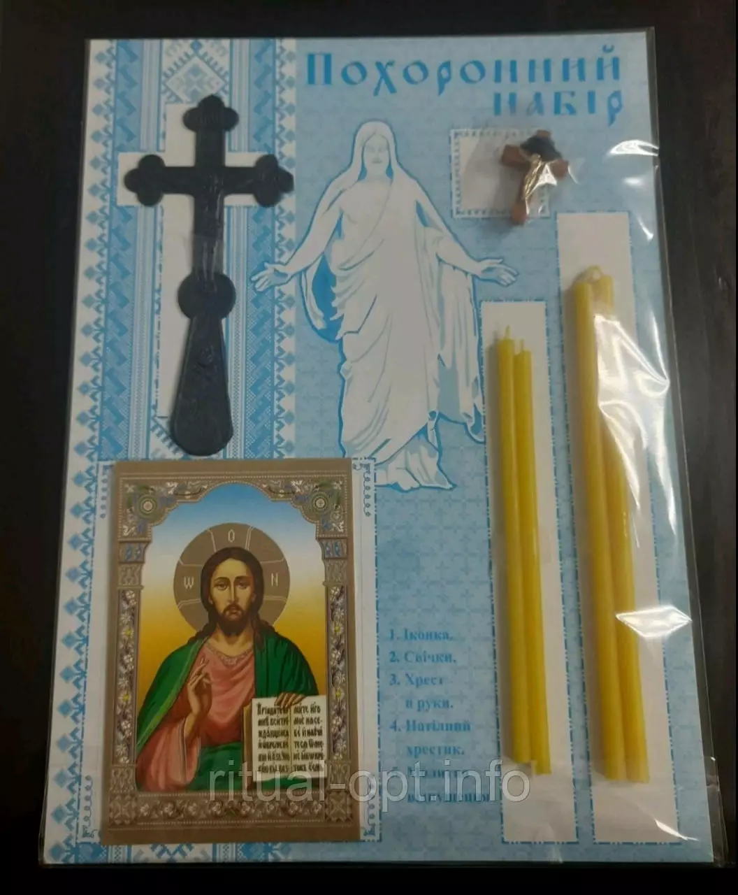 Набір похоронний (іконка, свічки 4 шт., натільний хрестик, хрестик в руки, молитва)