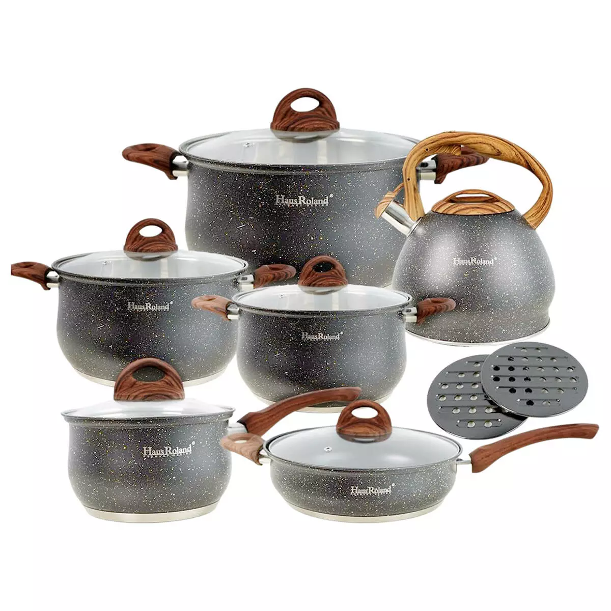 Три каструлі різного об'єму ідеально підходять для приготування супів, каш, макаронних виробів та інших страв. Підставки під каструлю захищають стільницю від подряпин та пошкоджень, а терка для овочів зі змінними лезами дозволяє швидко натерти овочі.