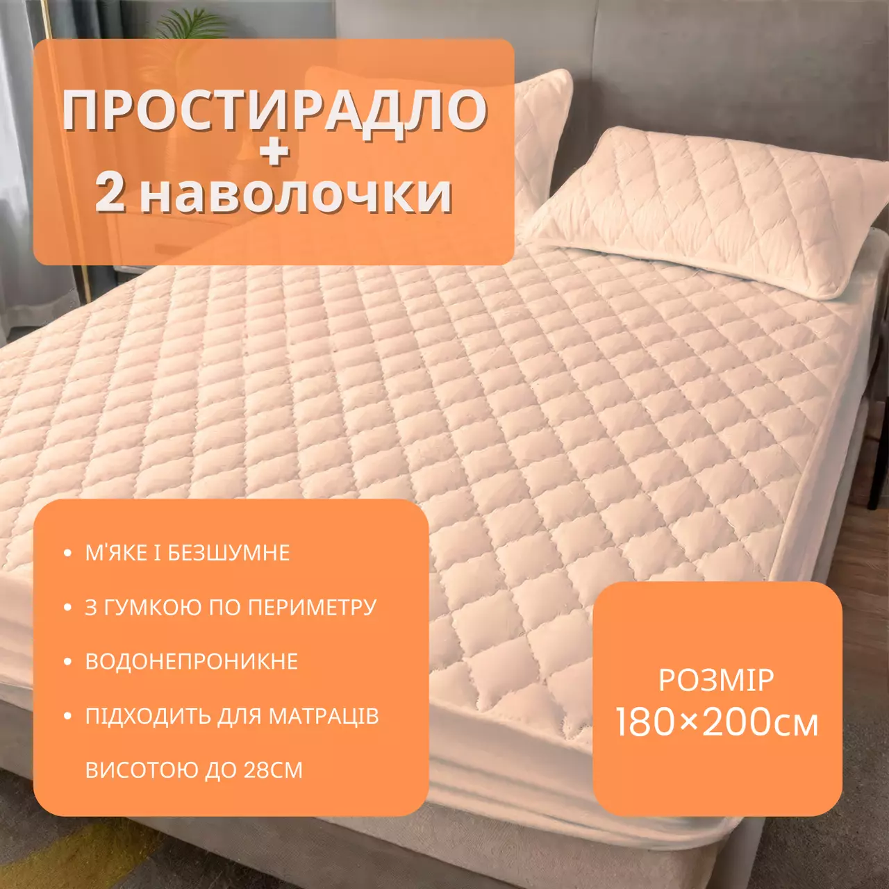 Комплект включає водонепроникне простирадло на гумці та дві