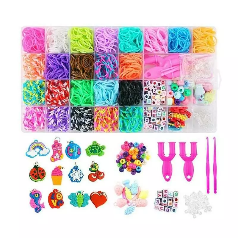 Набір резиночок для плетіння D 881 (60) 23 кольори, пластикова фурнітура, рогатки, гачки, пластик. карабіни, намистинки, підвіски, інструкція, в боксі