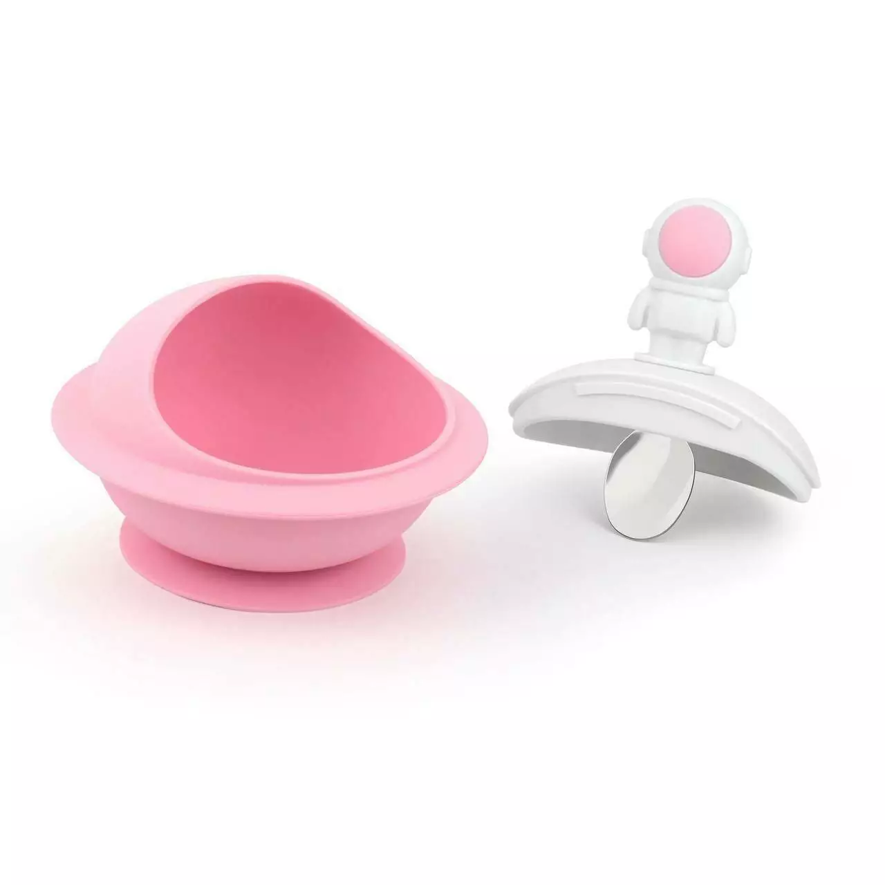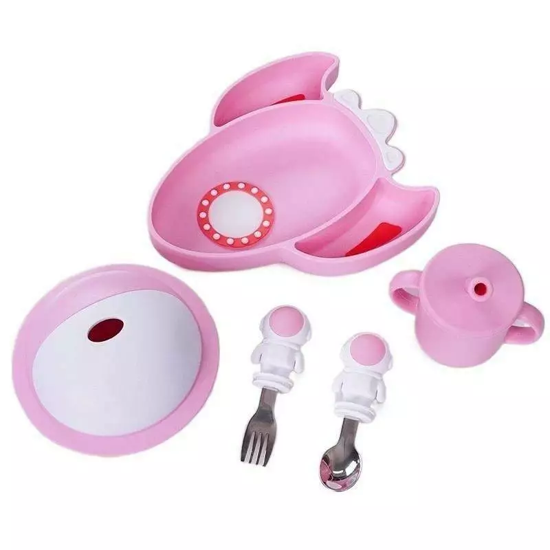 у дуже приємному рожевому кольорі. У комплекті: слинявчик, тарілка,