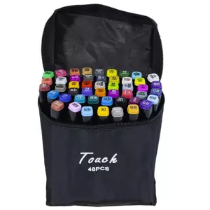 Набір двосторонніх фломастерів / скетч маркерів на спиртовій основі. У наборі 48 штук в пластиковому футлярі. З одного боку звичайний фломастер, з іншого боку скошений маркер. Кожен колір має свій цифровий код, який нанесений на ковпачок маркера. Колпочкі щільно закривають маркер, перешкоджаючи висиханню. Чорнило на спиртовій основі добре вбираються в папір, тому рекомендується використовувати щільні листи або картон