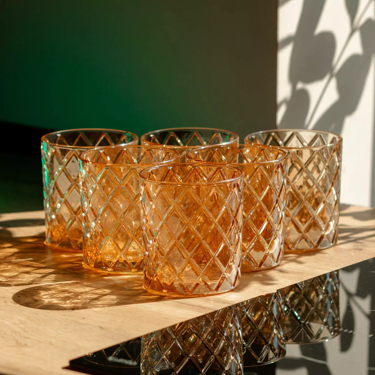 Поверхня склянок прикрашена декоративним ромбоподібним рельєфом, який не лише додає виразного візуального ефекту, а й забезпечує зручне утримання. Рельєф також допомагає приховувати відбитки пальців і краплі, зберігаючи привабливий вигляд під час використання.