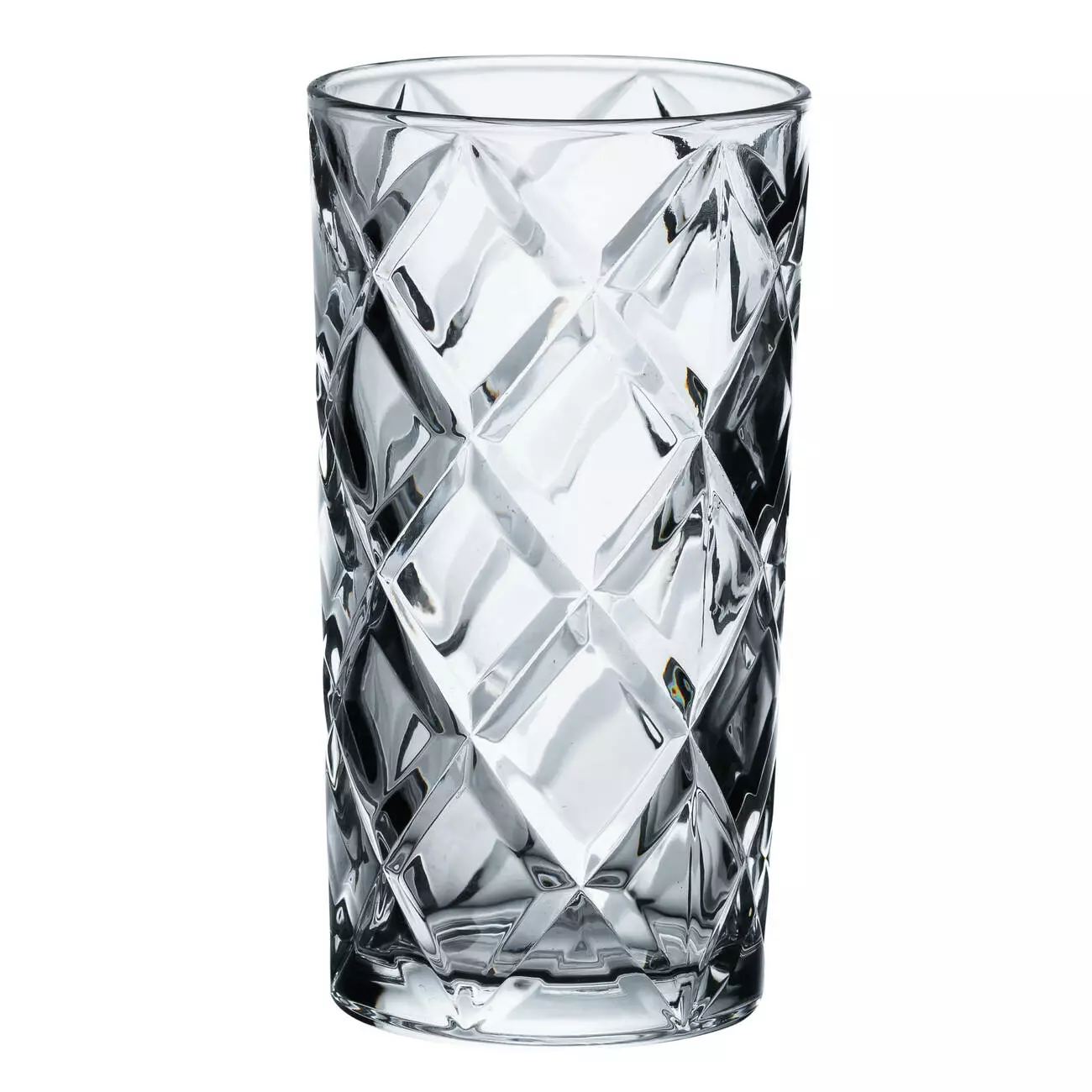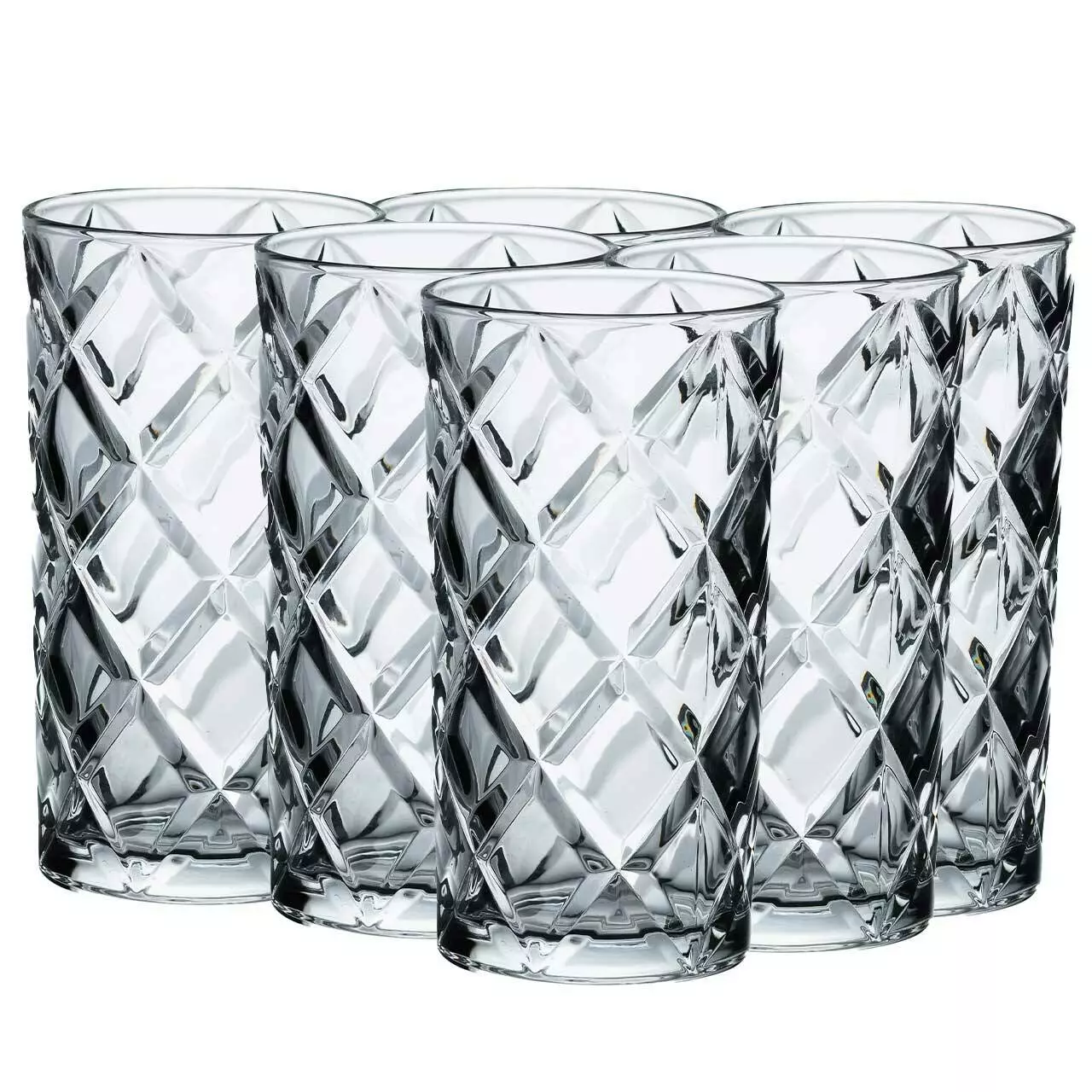 Набір з шести високих склянок з об'ємом 400 мл кожна, виготовлений з товстого прозорого скла, яке імітує сяйво кришталю. Їхні грані, що переливаються на світлі, надають кожній склянці розкішного вигляду і підкреслюють елегантність. Склянки створюють атмосферу святковості та витонченості, що робить їх ідеальним вибором для будь-якого напою.