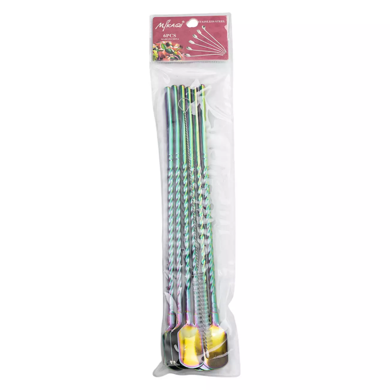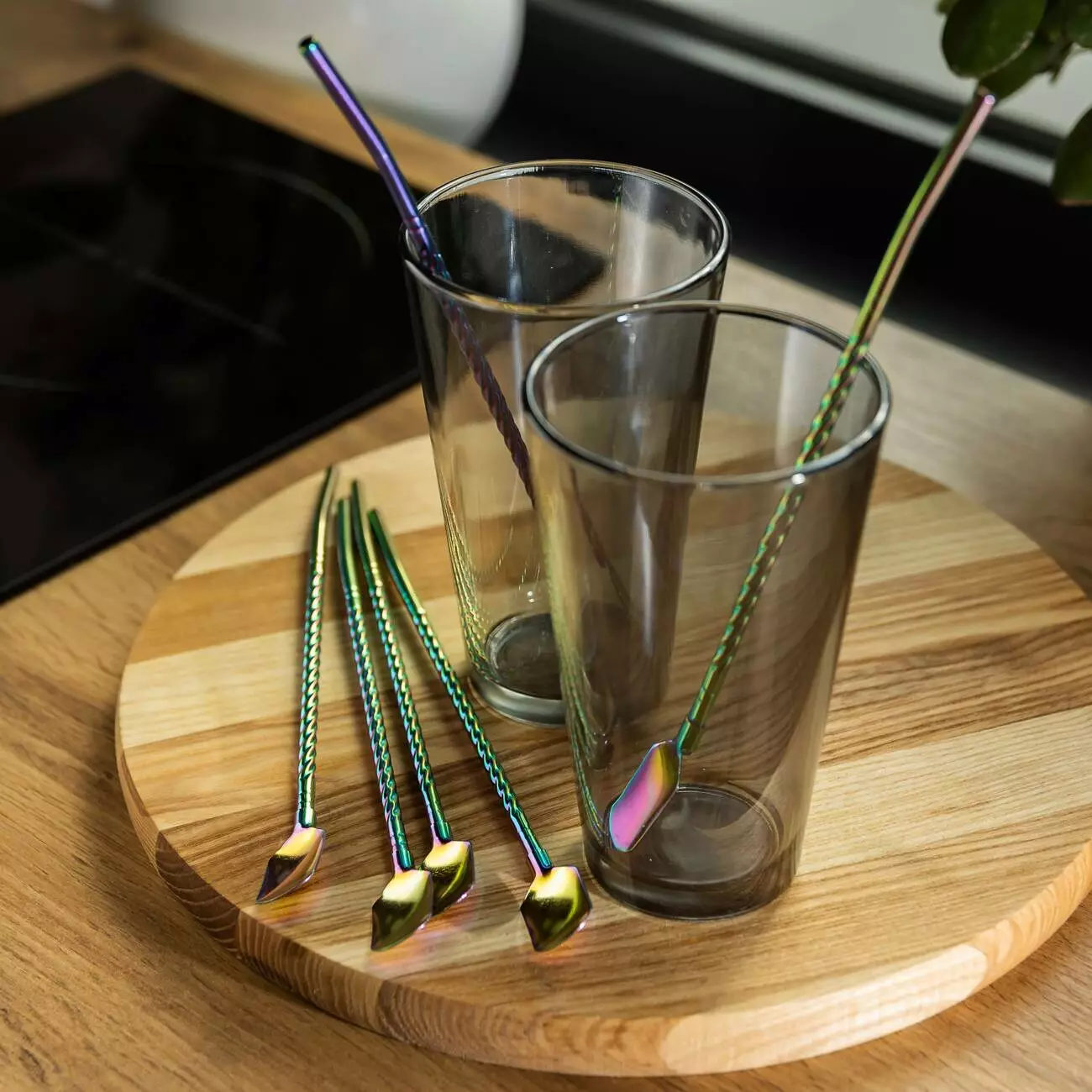 Набір включає 6 барних ложок та 1 щіточку. Кожна ложка має довгу закручену ручку, яка виконує функцію трубочки для напоїв. Така конструкція дозволяє зручно змішувати коктейлі, а також використовувати ложку як багаторазову екологічну альтернативу звичайним пластиковим трубочкам.