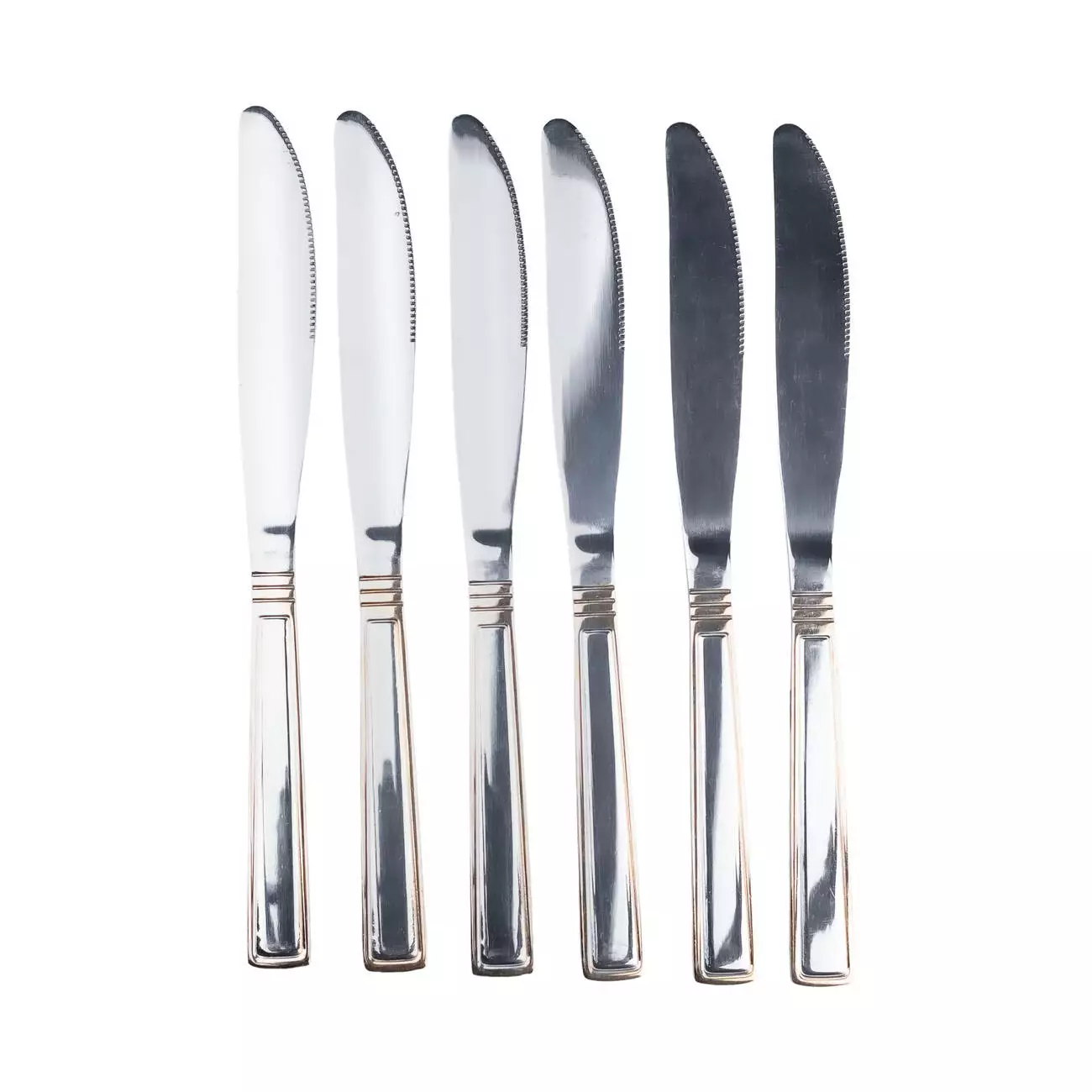 Набір столових ножів із 6 штук з облямівкою, хром із золотом – це елегантний і сучасний набір столових приладів, який ідеально підійде для будь-якого випадку. Ножі виготовлені з високоякісної нержавіючої сталі з хромованою та золотою обробкою, що робить їх міцними та стійкими до іржі. Вони також мають обробку з облямівкою, яка додає нотку елегантності. Ножі безпечні для миття в посудомийній машині, що полегшує очищення.