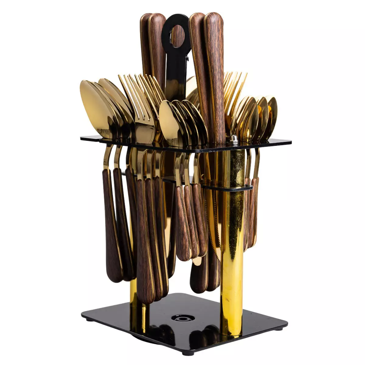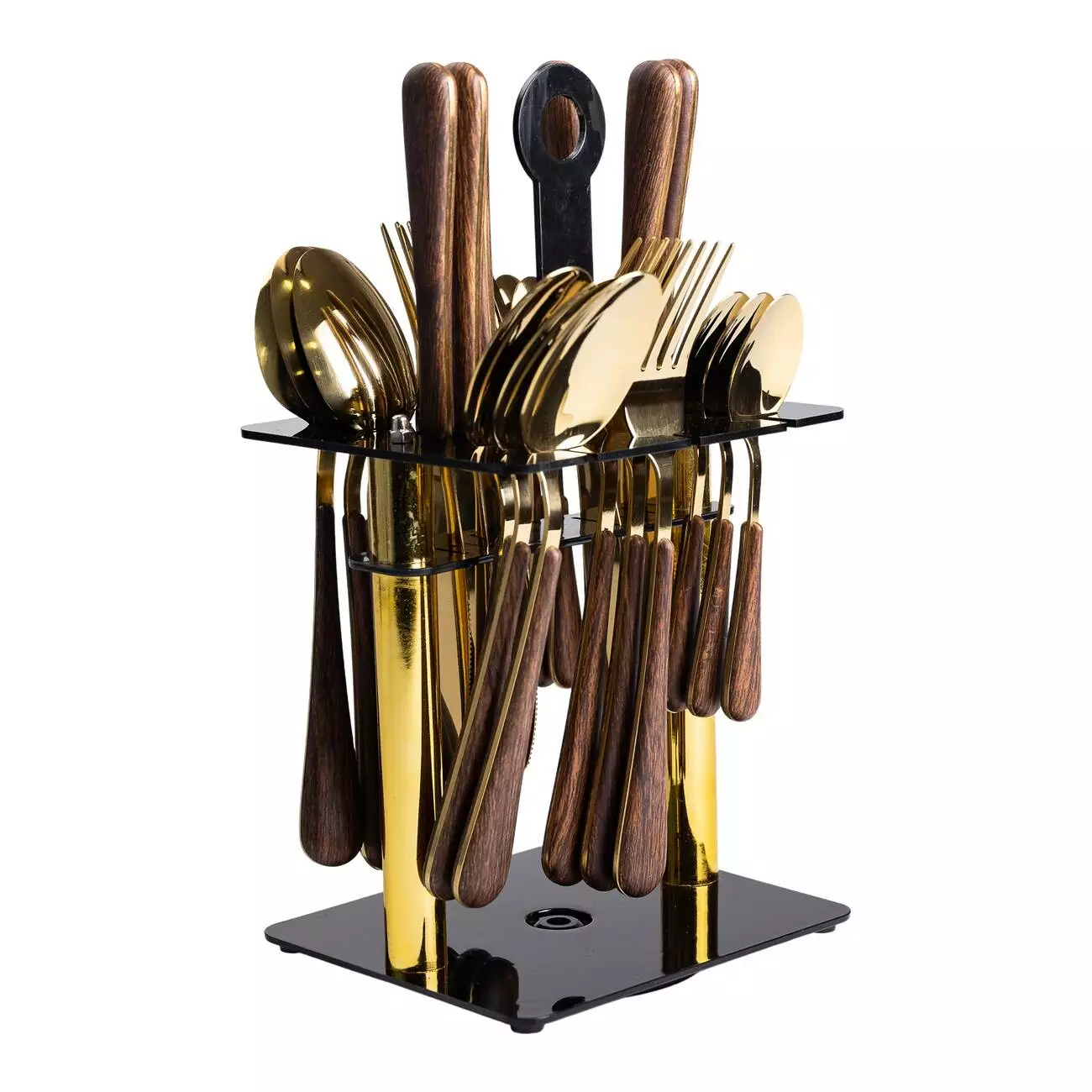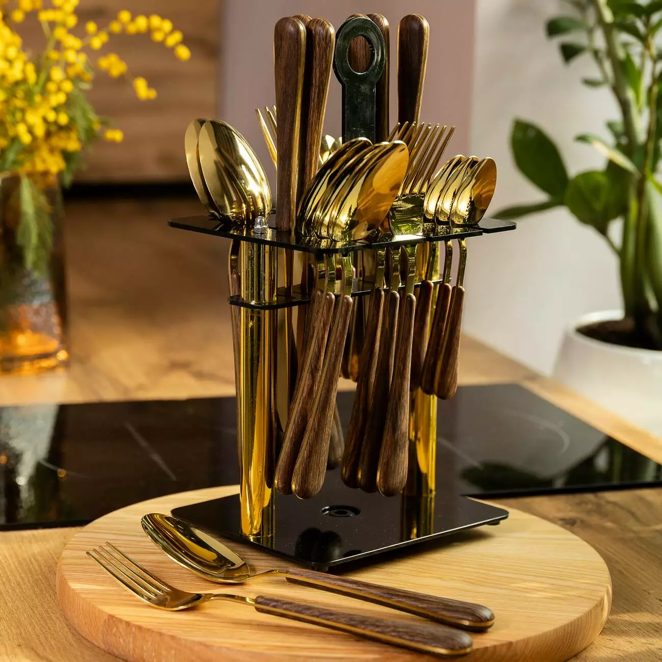 Набір столових приборів розрахований на 6 персон і включає 24 предмети. Виготовлений із нержавіючої сталі з дзеркальною поверхнею, що забезпечує естетичний вигляд та стійкість до корозії. Ручки приборів виконані з дерева, що додає природного тепла та комфорту під час використання.