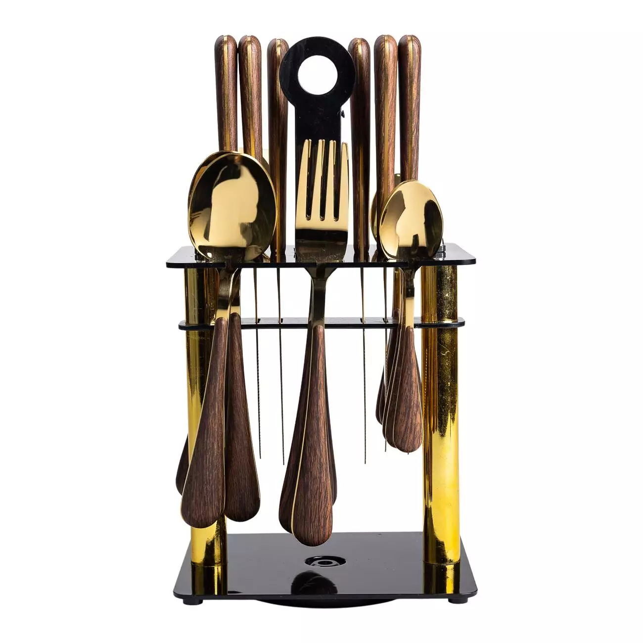 До комплекту входять столові ложки, виделки, ножі та чайні ложки. Всі предмети мають оптимальну довжину для зручності в користуванні. Дзеркальне покриття надає набору елегантного вигляду, а дерев'яні ручки додають особливого шарму.