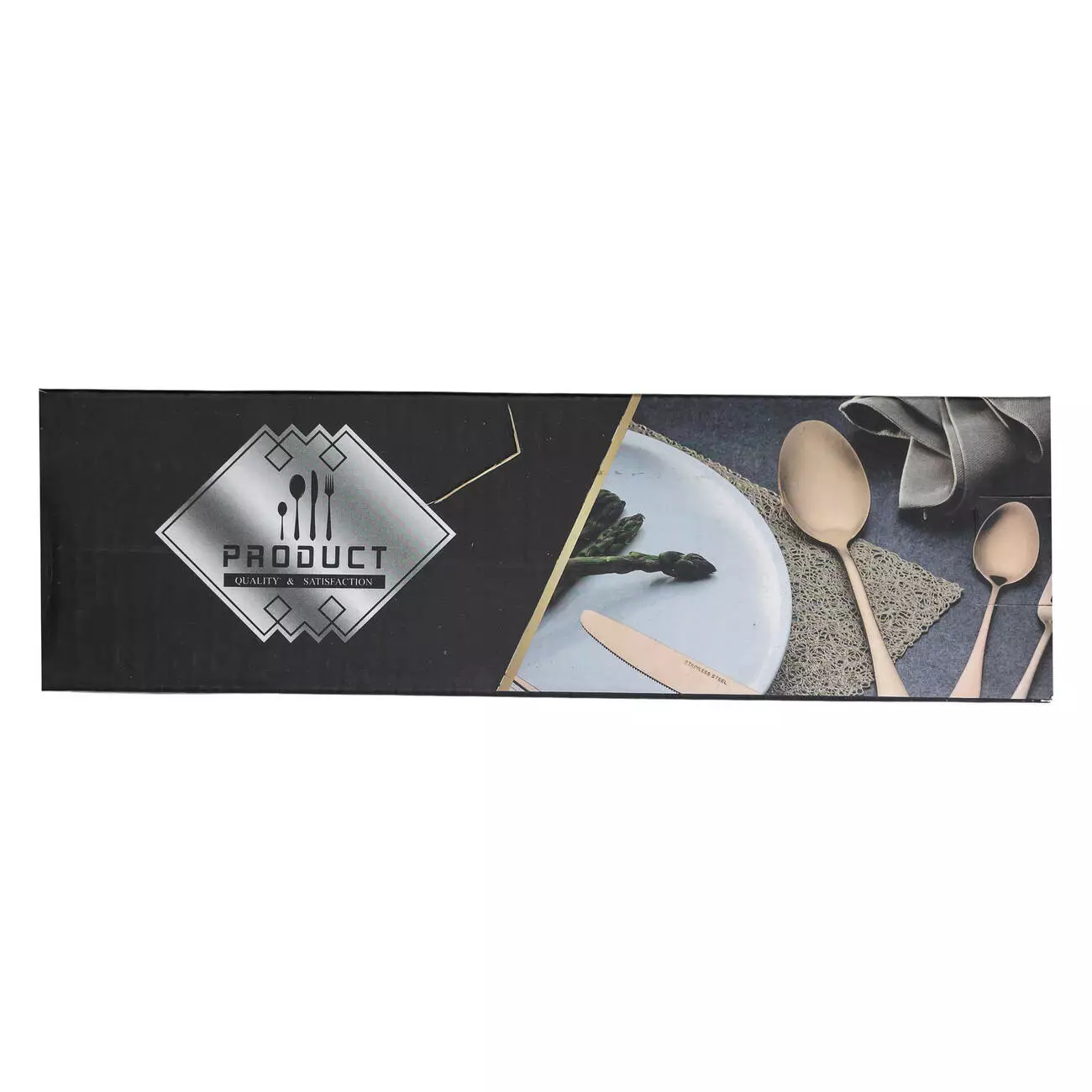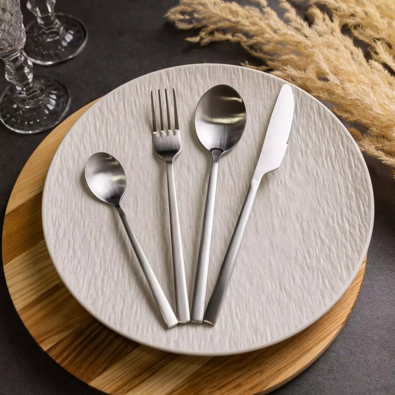 Всі прибори виготовлені з нержавіючої сталі, що забезпечує їхню міцність, стійкість до корозії та довговічність. Особливістю цього комплекту є матова поверхня, яка надає виробам стильного вигляду та запобігає появі відбитків пальців. Лаконічний дизайн підходить до різних стилів сервірування.