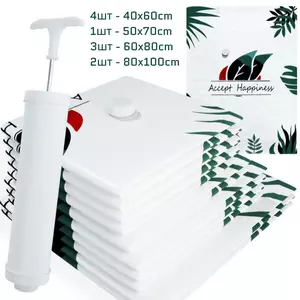 Вакуумні пакети – ідеальне рішення для економії місця та надійного зберігання одягу й текстилю. Завдяки герметичному замку та відкачуванню повітря речі залишаються захищеними від вологи, пилу, комах і неприємних запахів. Пакети можна використовувати багаторазово, а в комплект входить зручна ручна помпа.