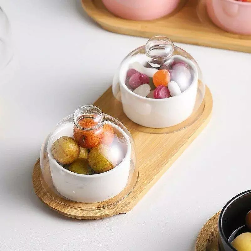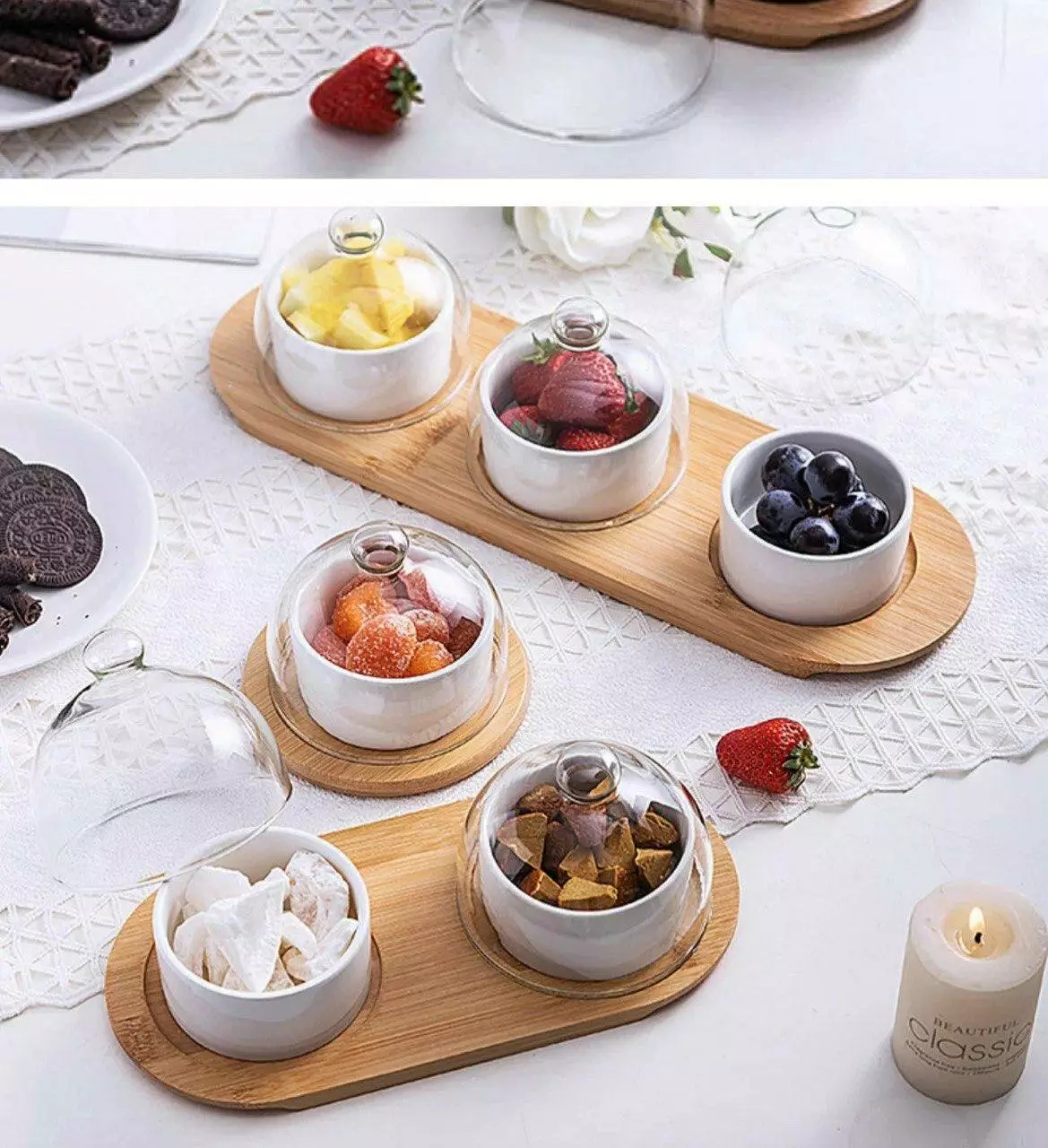 прозорими скляними кришками та елегантним дерев'яним підносом.