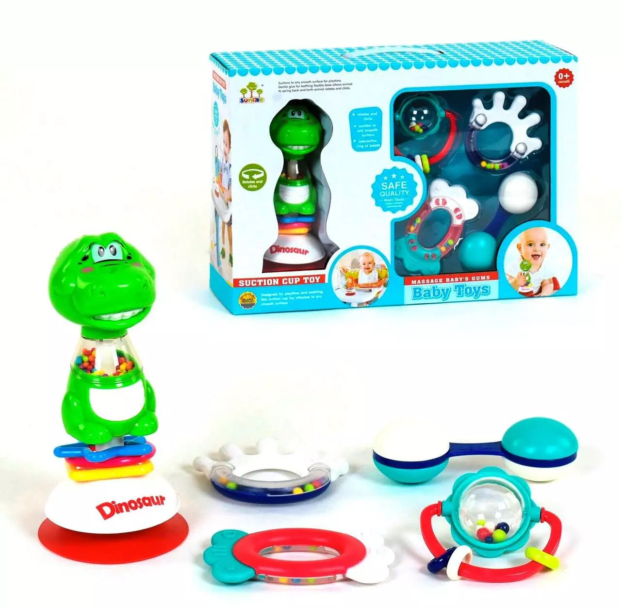 5-ти развивающих погремушек. Благодаря погремушкам малыш учится