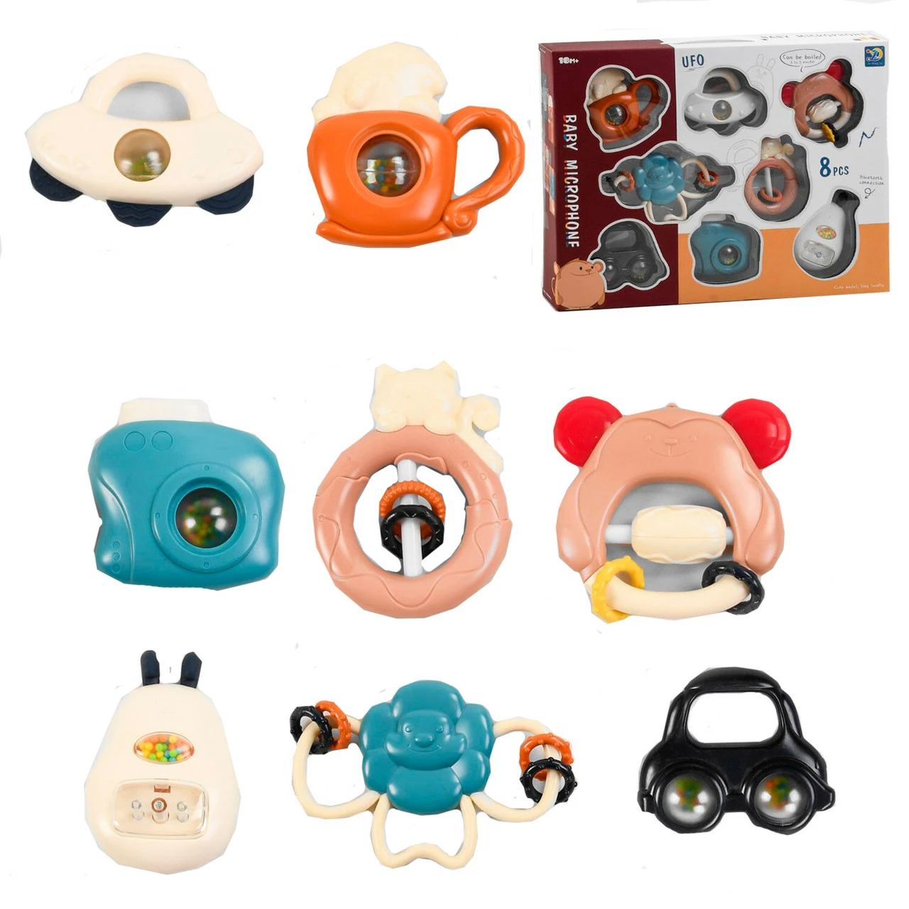 комплектацию входит 8 погремушек с мягкими резиновыми грызунками,