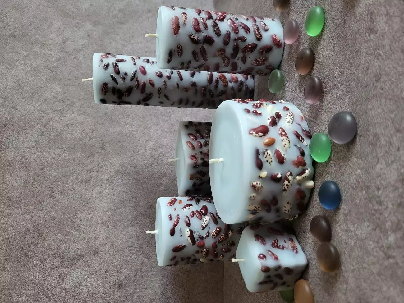 Набори із 6 свічок з декором із різного зерна або сухоцвітів. Свічку виготовлено так, що декор під час горіння не страждає. Колір свічок і сам декор обговорюється під час замовлення. Кількість можна змінювати. Тут все індивідуально.