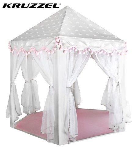 Замок із тканини, безумовно, є незамінним помічником у дитячих пустощах. Він має шестикутну основу, 6 вхідних отворів і конусоподібний навіс. Входи закриті напівпрозорими білими фіранками, які чудово поєднуються з іншою частиною намету. Фіранки можна зав'язати або задрапірувати різними способами декоративними стрічками. Це рішення разом із бантами надає вечірці чарівного штриха.