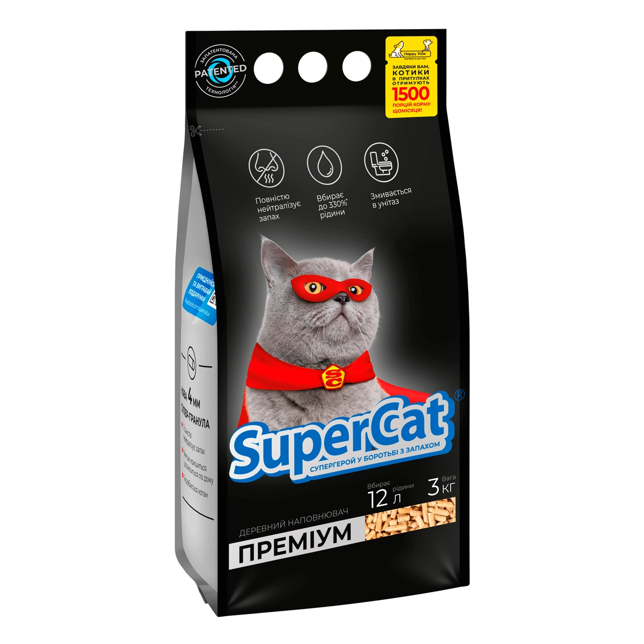 Древесный наполнитель SuperCat® ПРЕМИУМ для кошачьего туалета.