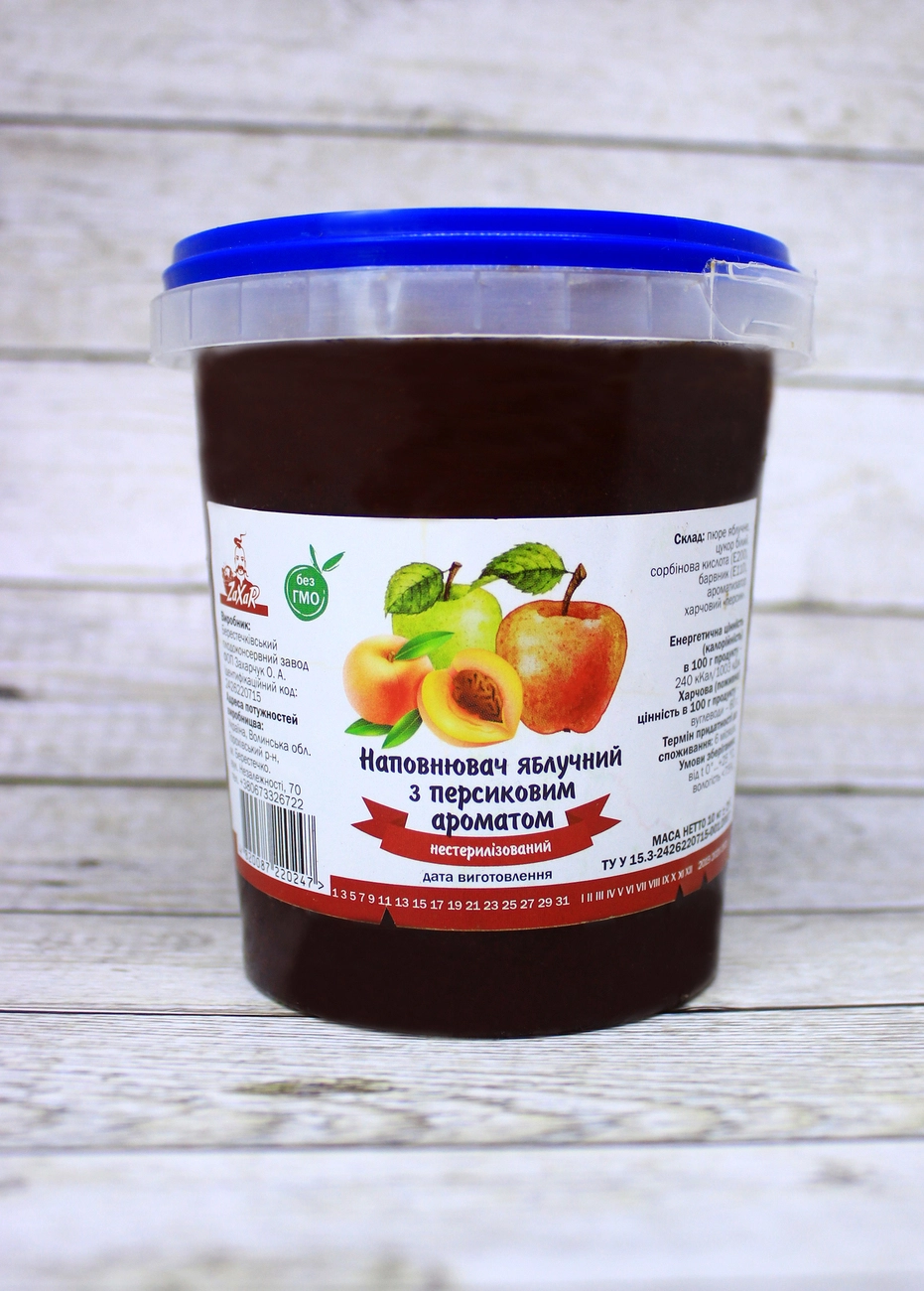 Состав: пюре яблочное, сахар, консервант Е200, краситель Е110, ароматизатор идентичный натуральному «Персик». Энергетическая ценность (калорийность) - 240 ккал / 100 г. Пищевая (питательная) ценность 100 г: углеводов - 60 г. Срок годности - 6 м.