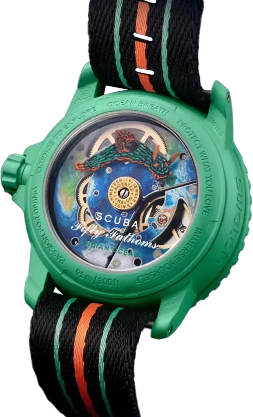 Традиционно Swatch предоставляет возможность рассмотреть механизм SISTEM51 через прозрачную заднюю крышку. На каждой из пяти моделей коллекции Bioceramic Scuba Fifty Fathoms можно увидеть изображение одного из удивительных и ярких голожаберных моллюсков, которые обитают в пяти соответствующих океанах.