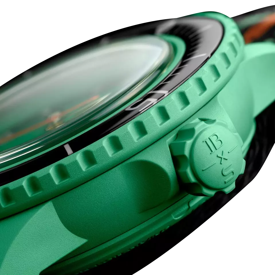 Модель INDIAN OCEAN с биокерамическим корпусом, циферблатом ярко-зеленой расцветки и ремешком NATO, произведенном из переработанных рыболовных сетей, прекрасно передает ослепительную красочность Индийского океана.