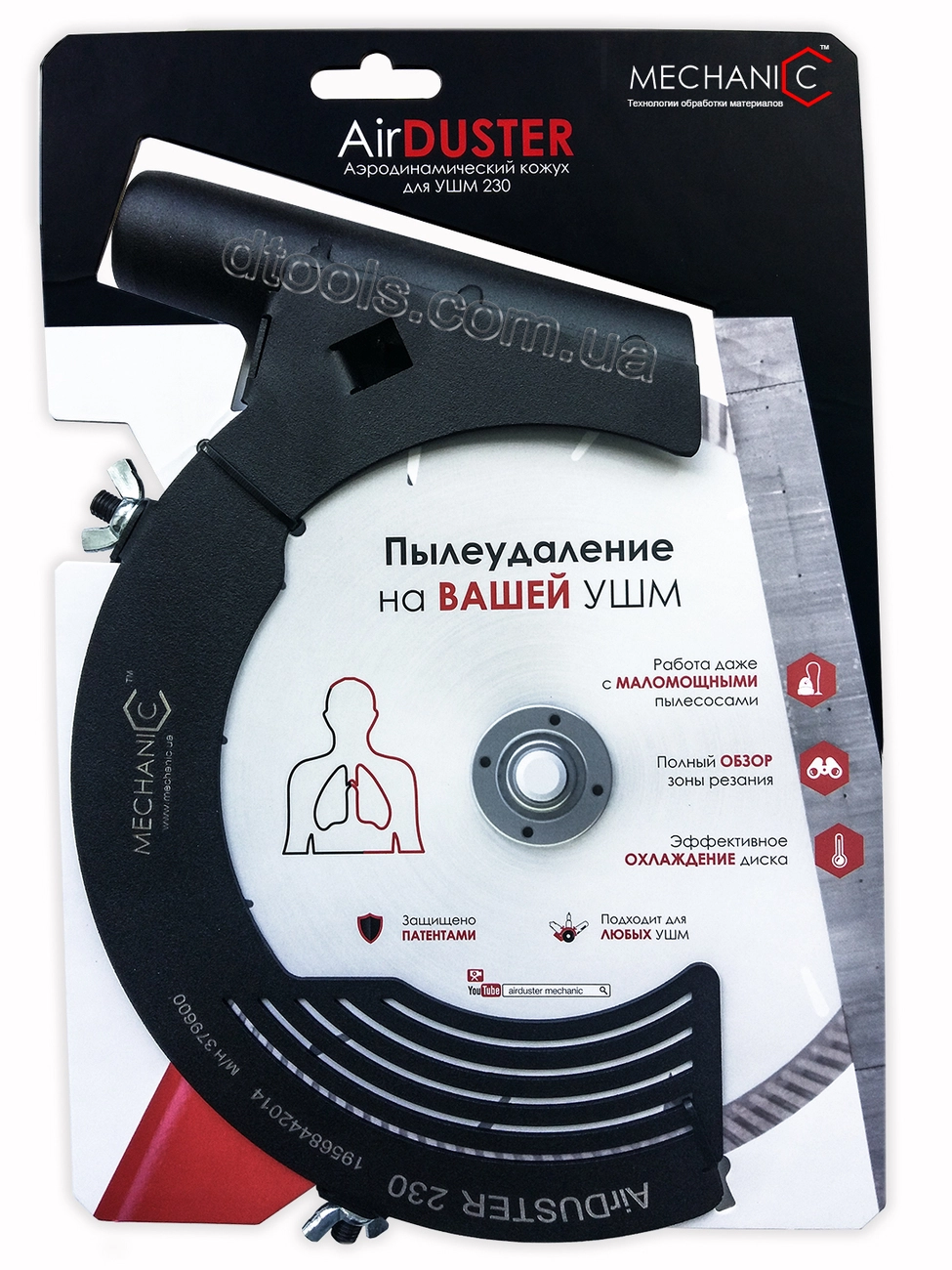 Универсальный кожух для болгарки с пылеотводом Mechanic Air Duster. Инновационное приспособление для качественной работы с УШМ было разработано и запатентовано компанией Дистар и производится под маркой Механик. Изделия изготавливаются в двух размерах – для круга отрезного 230 и 125 миллиметров.