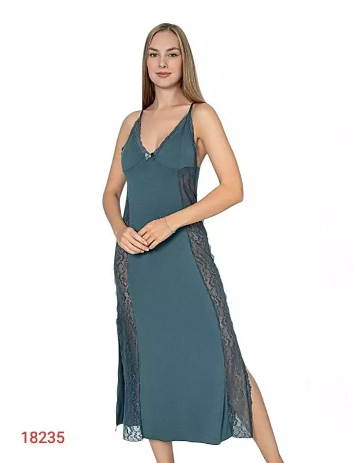 Елегантна подовжена нічна сорочка. Модель виконана з приємної до тіла тканини,яка дарує комфорт під час сну та відпочинку.Верх виробу оздоблений  мереживом та має спокусливі бокові мереживні елементи. Тонкі брителі та розріз додають жіночності та витонченості.