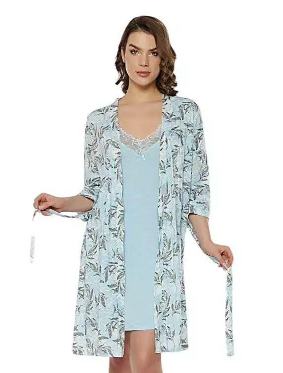 Елегантний жіночий комплект для дому та сну,що складається з нічної сорочки на тонких бретелях  та легкого халату. Виконаний з якісної тканини ,нічна сорочка однотонна оздоблена мереживом,халат на запах з квітковим принтом, що додає образу ніжності і жіночності.