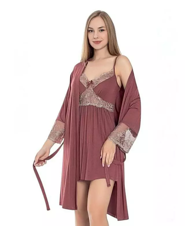 Елегантний жіночий комплект для дому та сну,що складається з нічної сорочки на тонких бретелях  та легкого халату. Виконаний з якісної тканини ,нічна сорочка однотонна оздоблена мереживом,халат на запах оздоблений на рукавах мереживом, що додає образу ніжності і жіночності.
