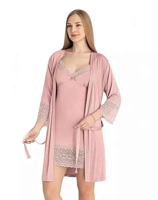 Елегантний жіночий комплект для дому та сну,що складається з нічної сорочки на тонких бретелях  та легкого халату. Виконаний з якісної тканини ,нічна сорочка однотонна оздоблена мереживом,халат на запах оздоблений мереживом, що додає образу ніжності і жіночності.