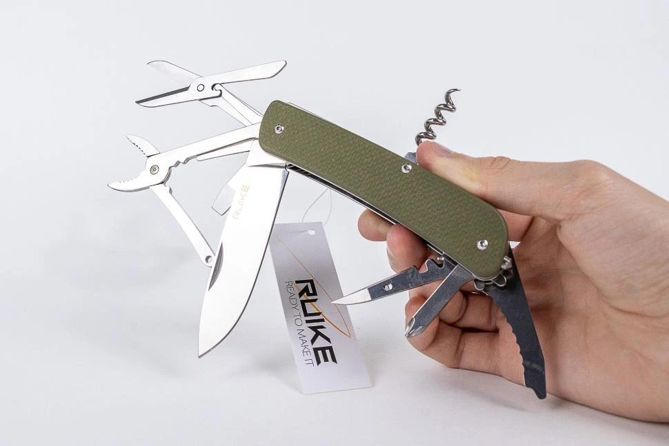 Для туристичних цілей як не можна краще підходить саме складаний ніж. Його зручно транспортувати, безпечно використовувати. Але особливо практичні для рибалок і туристів багатофункціональні моделі, як, наприклад, Ruike L41. Це якісний ніж з добре продуманим набором функцій. Він складається відразу з декількох інструментів з однією загальною рукояткою, які можна використовувати по черзі. Але головним серед них є саме ножа. Розмір леза цього ножа становить по довжині 85 мм. Товщина клинка по обуху не перевищує 3 мм. Вся його ріжуча кромка гладко заточена, що робить ніж універсальним в роботі з різними матеріалами. Крім того, доглядати за добре заточеним ножем простіше, ніж за серрейторным лезом.