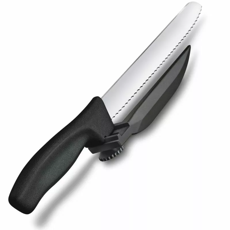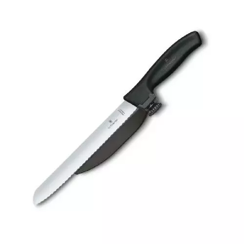 Новинка 2019 року - кухонний ніж Victorinox Swiss Classic DUX 6.8663.21 з регульованою направляючої від професійних ножовщиков Victorinox (Швейцарія). Призначений для акуратної і рівною нарізки на однакові шматочки. Серія Swiss Classic (Свісс Класік). Дуже простий у використанні і легко справляється з усіма видами продуктів. Наріже шинку, овочі, а завдяки зазубленому краю впорається навіть зі свіжоспеченим хлібом. Ніж DUX 6.8663.21 наділений гострим лезом з хвилястою (серрейторной) кромкою і ергономічною ручкою з регульованою направляючої для точної нарізки. За допомогою спеціального обертового колеса на ручці ножа Ви зможете відрегулювати бажану товщину нарізки від 1 до 15 мм.