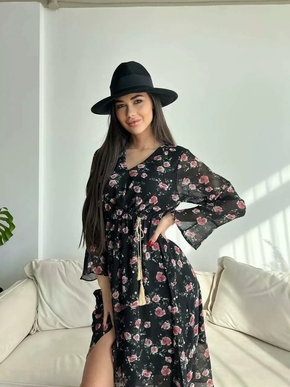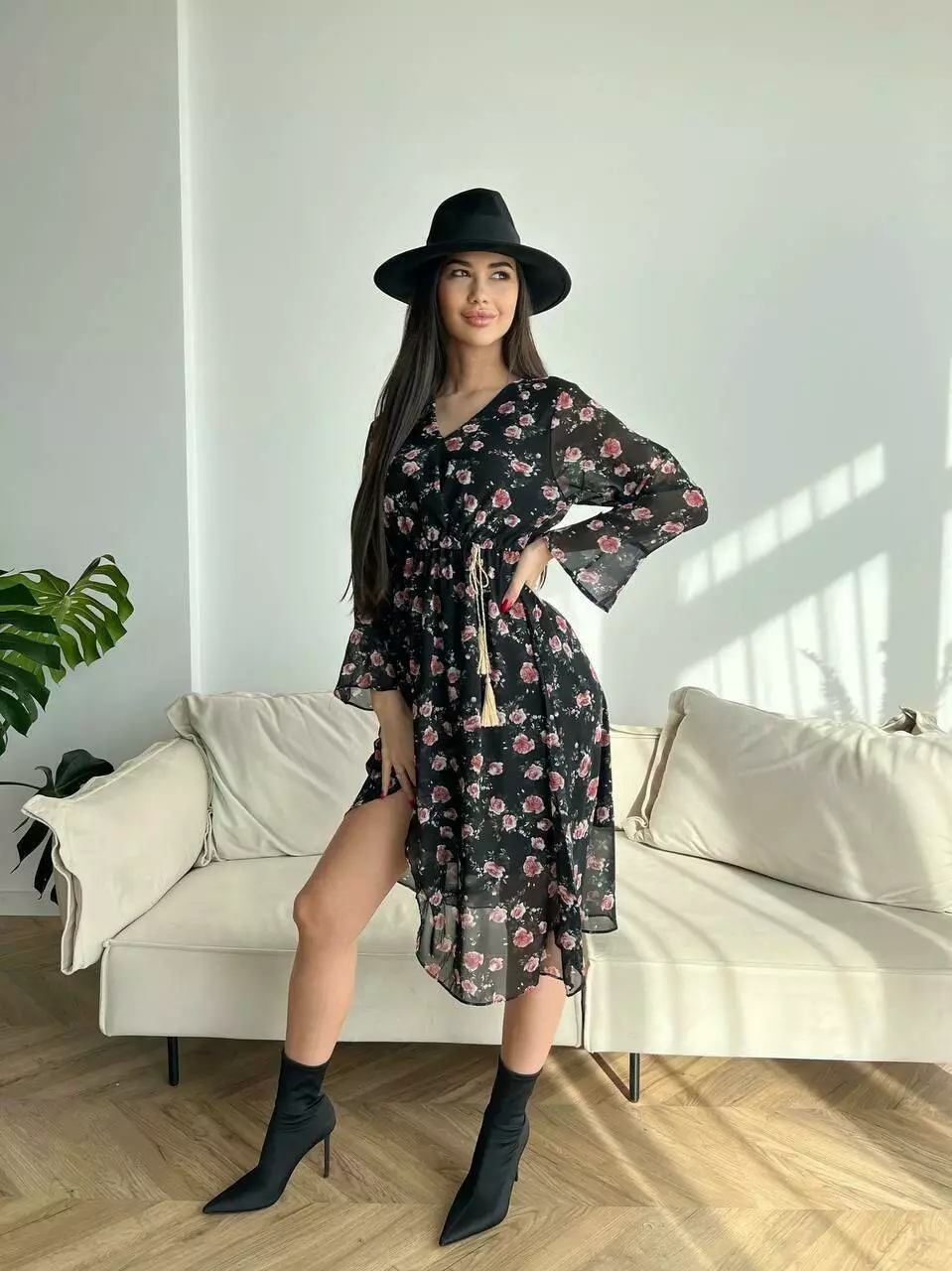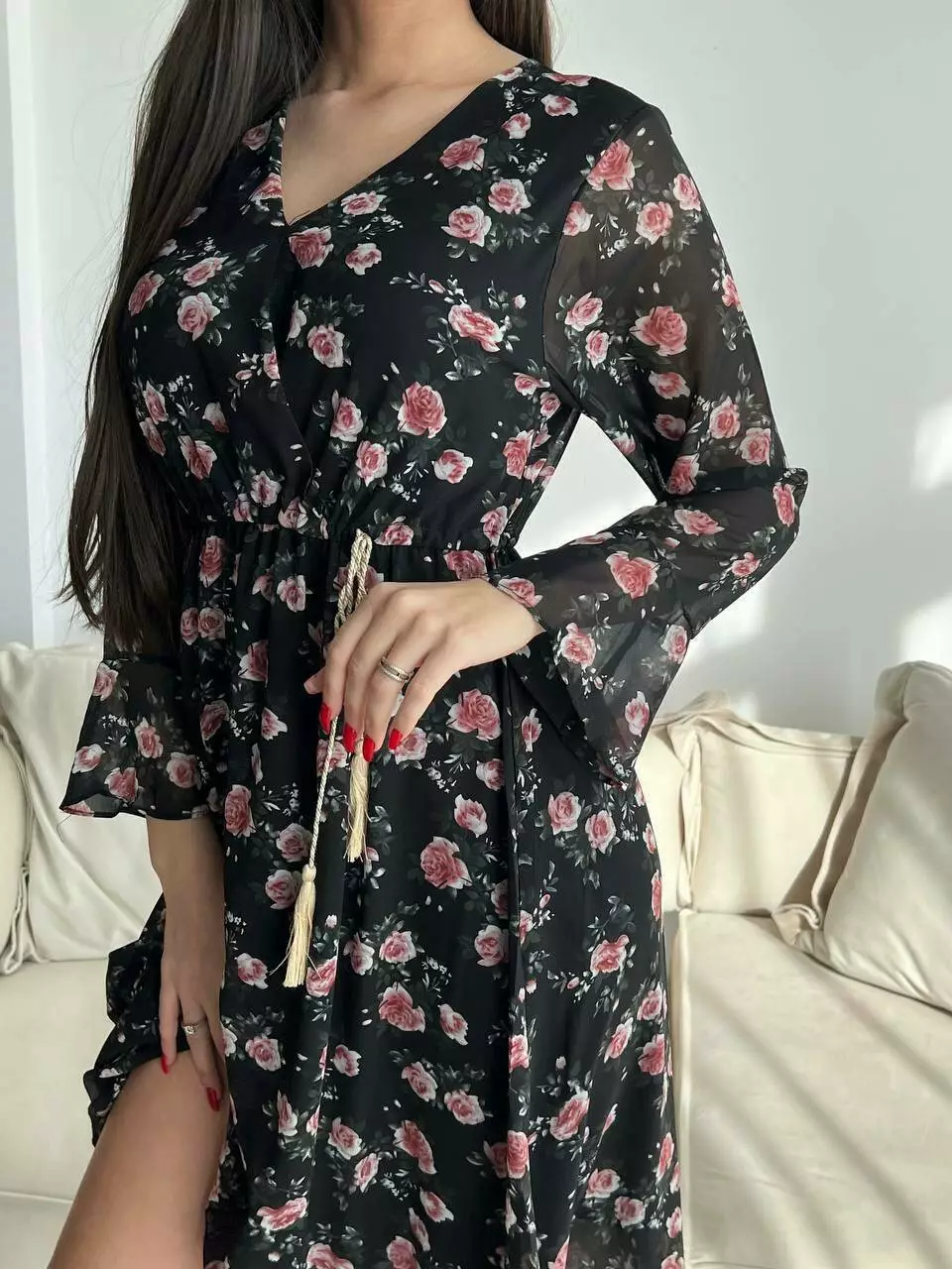 Ніжне жіноче шифонове плаття з квітковим принтом і довгим рукавом 661