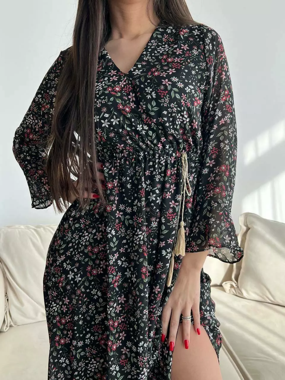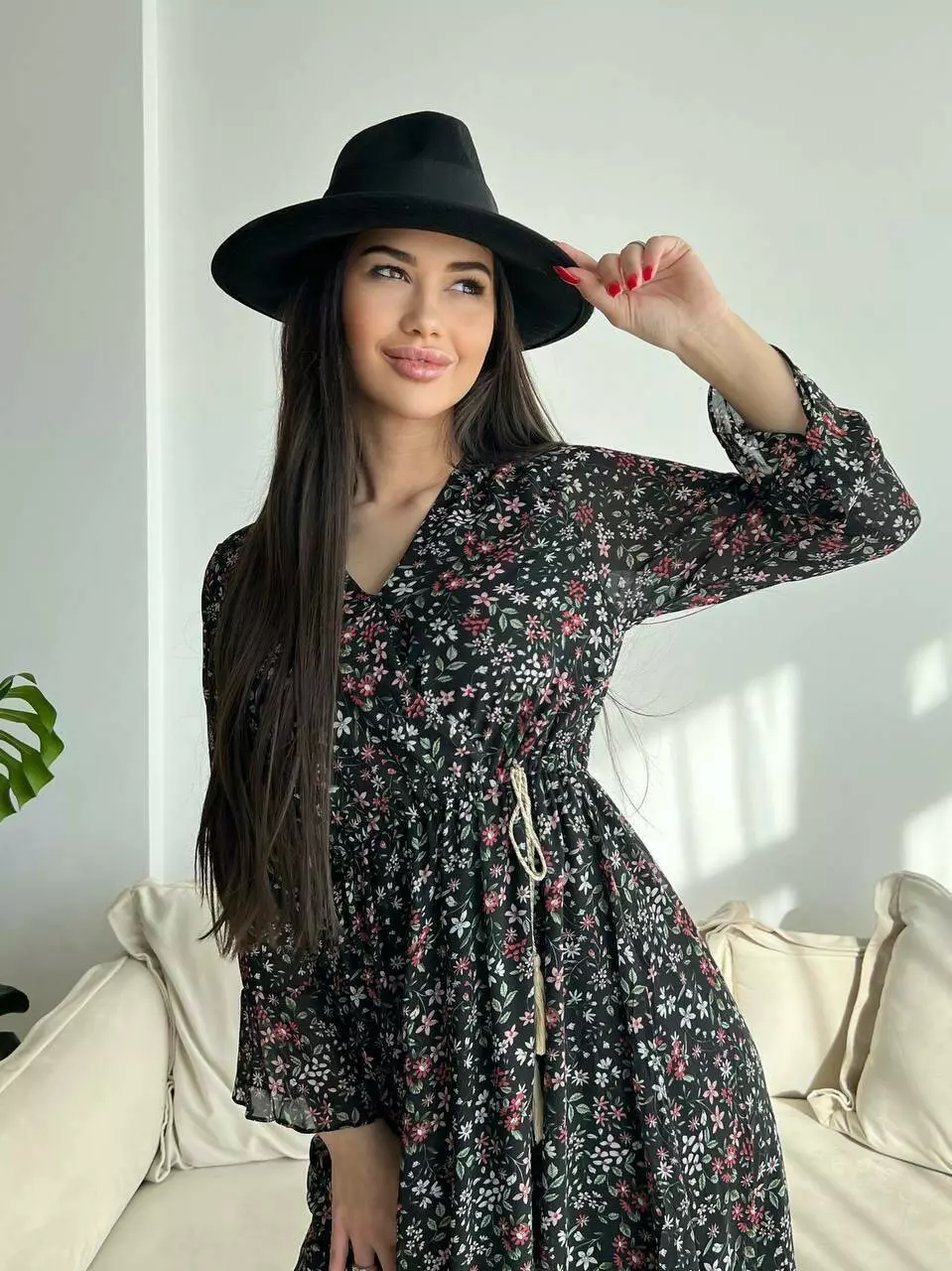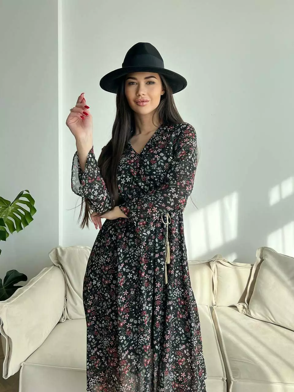 Ніжне жіноче шифонове плаття з квітковим принтом і довгим рукавом 661