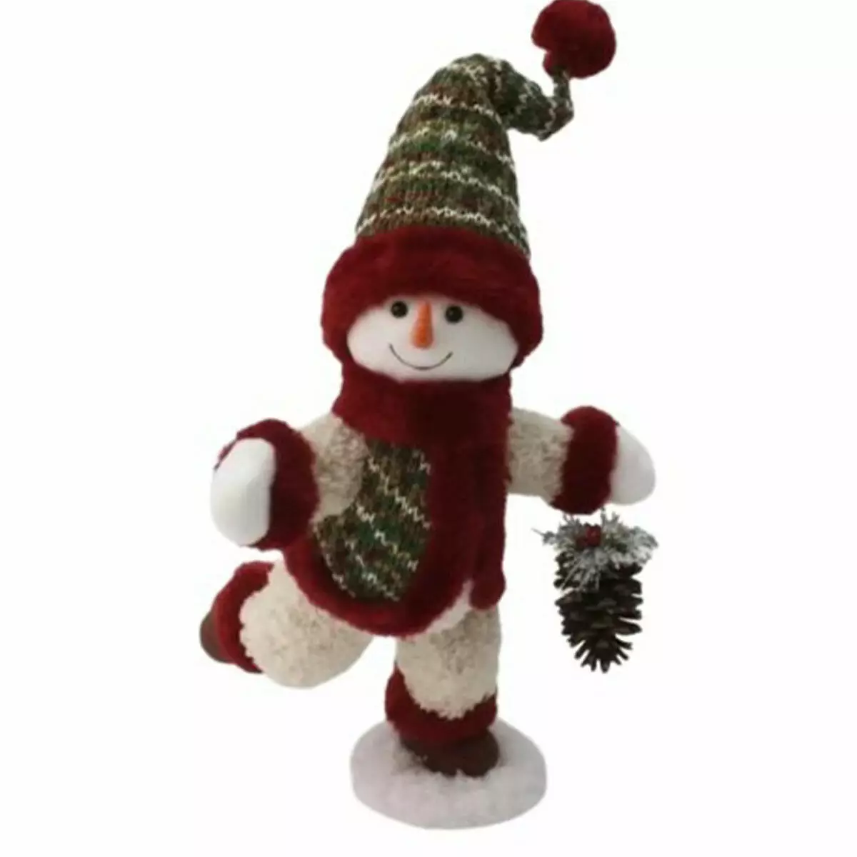 Фігурка виконана з м’якого білого матеріалу з текстурою, що нагадує сніг. Сніговик одягнений у червоно-зелений светр і червоно-зелений в’язаний ковпак з помпоном. Його піджак — зелений з червоними манжетами, а взуття — коричневе. Одна нога піднята, одна рука простягнута з декоративною шишкою, прикрашеною хвоєю та ягодами. Вага 600 г забезпечує стійкість на круглій основі, що імітує сніг.