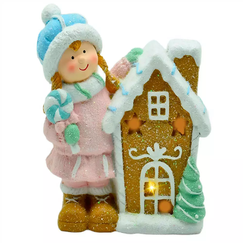 Мила порцелянова фігурка у вигляді маленької дівчинки поруч із пряничним будиночком - затишний акцент у новорічному інтер'єрі. Компактні розміри роблять її ідеальним доповненням полиць, підвіконня або святкового столу, а м'яке підсвічування та штучний сніг надають фігурці особливого казкового шарму.