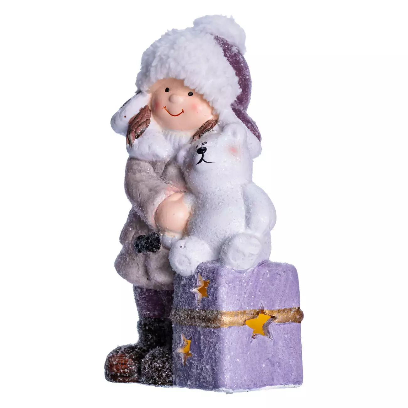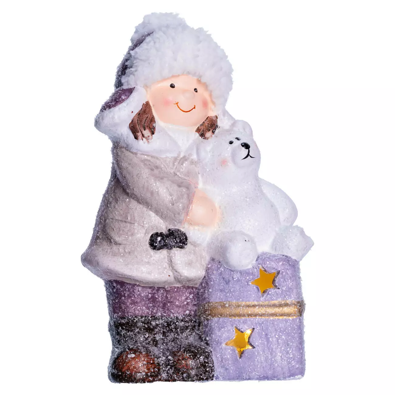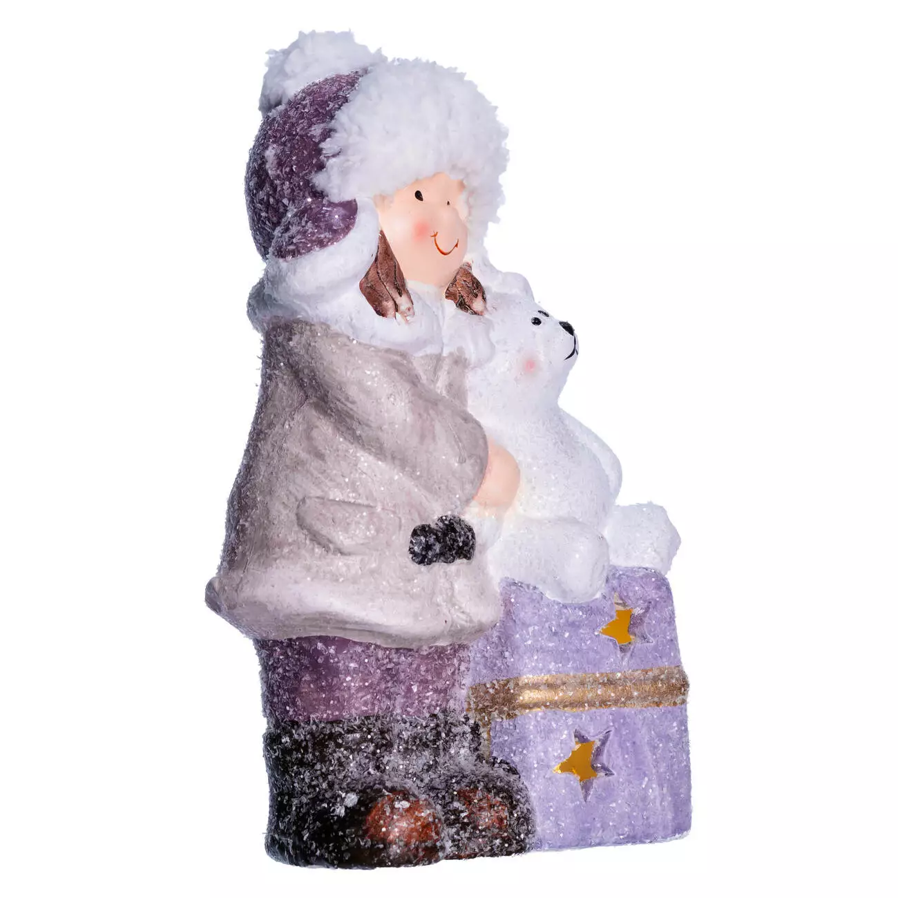 Фігурка зображує усміхнену дівчинку в білому хутряному капелюсі, бежевому пальті та фіолетових штанах. Вона тримає білого ведмедика, що сидить на подарунковій коробці фіолетового кольору з золотими зірками та жовтою стрічкою. Поверхня фігурки має легкий блиск, що імітує сніг, а вбудована підсвітка створює тепле світіння, підкреслюючи деталі оздоблення. Матеріал — порцеляна, вага — 400 г, що забезпечує стабільність і зручність у розміщенні.