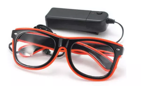 Данные очки оснащены светодиодной неоновой полоской и маленьким удобным блоком питания для двух обычных батареек AA ( пальчиковые 1,5V ) с переключателем режимов свечения. Свечение происходит в трех режимах: обычный статический, вспышка, flash.