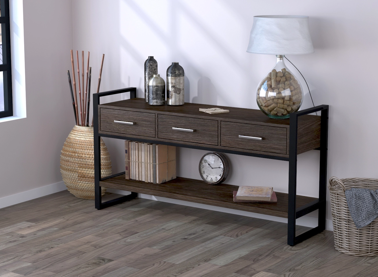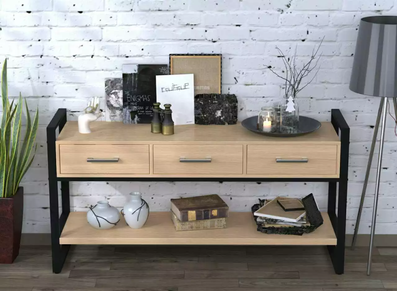 Консоль с ящиками L-145 от компании Loft Design выдержанна в стиле Лофт. Изделие сочетает функциональность, внешнее изящество и строгость линий, присущую индустриальному интерьеру. Главная особенность мебели — её универсальность. Консоль органично впишется в интерьер как офисного, так и жилого помещения. Её можно использовать как тумбу под телевизор или тумбу в гостиную или прихожую. В спальне из нее в сочетании с зеркалом получится отличный туалетный столик. Просторная столешница позволит разместить множество вещей. Выдвижные ящики с телескопическими направляющими очень удобны для хранения малогабаритных вещей.