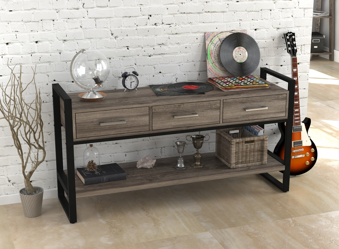 Внешне консоль напоминает низкий стеллаж. Строгая геометрия форм компенсируется добротностью металла и благородной текстурой ДСП.