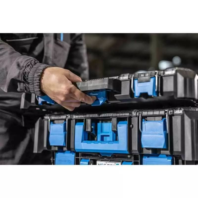 Органайзер легко комбинируется с другими модулями, что позволяет расширять систему хранения. Компактная высота подходит для размещения на полках и в ящиках. Удобная фиксация крышки предотвращает случайное открывание во время транспортировки.