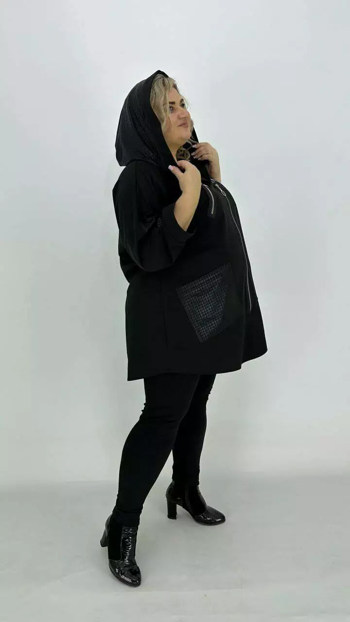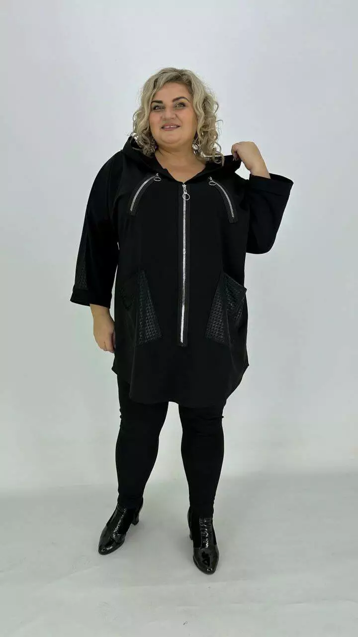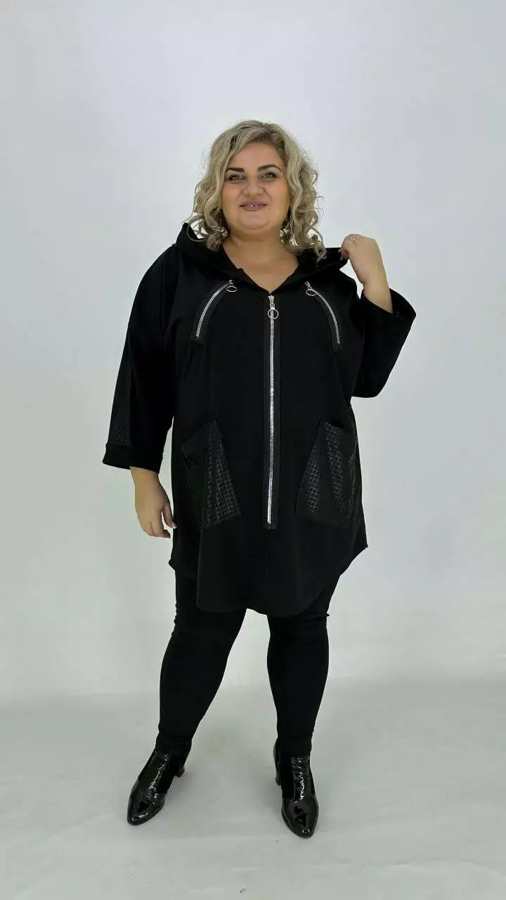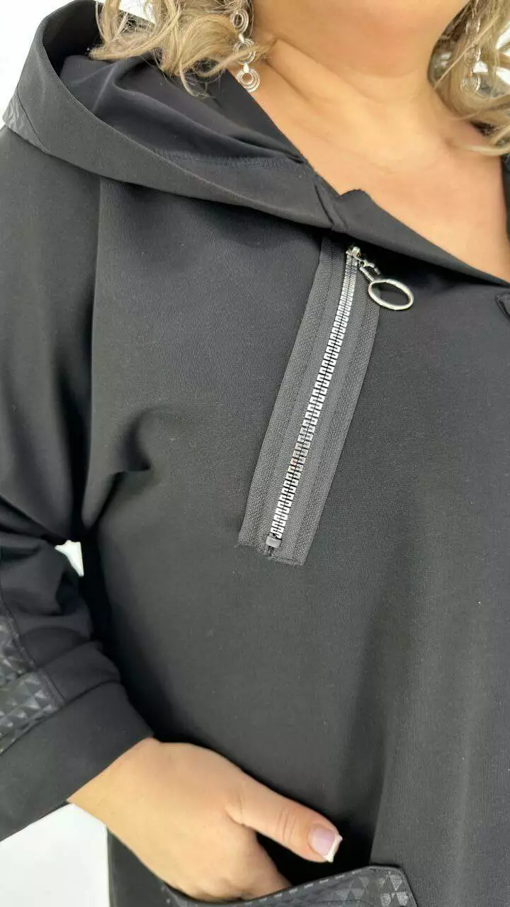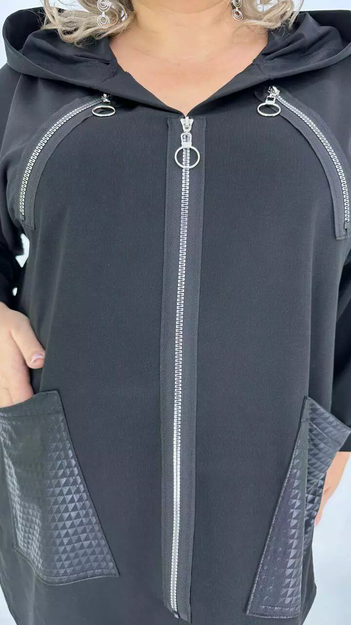 Туніка оверсайз з трикотажу двонитка з гарною розтяжністю, комбінована з біфлексом з лаковим напиленням, декоративні змійки. Вільний крій зі спущеним плечем підходить під будь-які груди. Розмір підбирати за обсягом стегон. Кишені накладні з капюшоном, рукав 5/6.