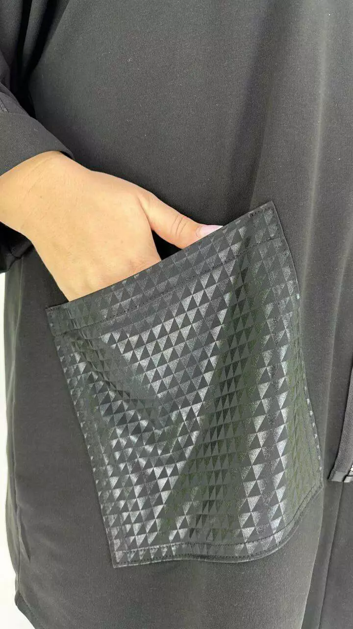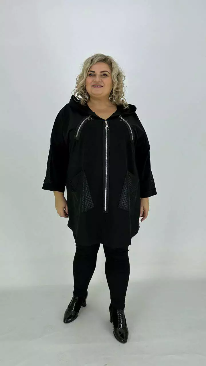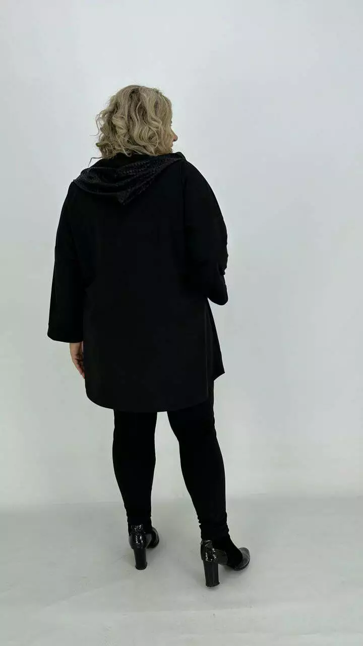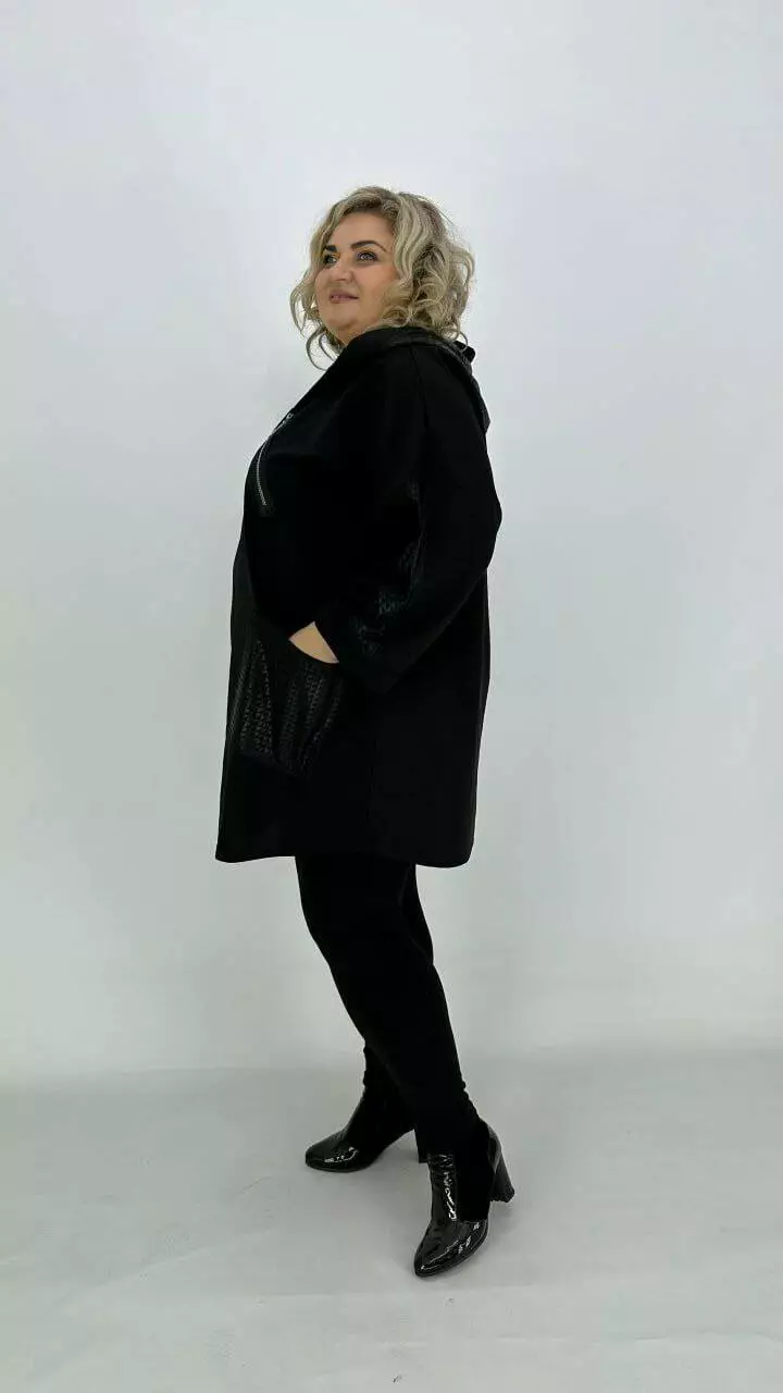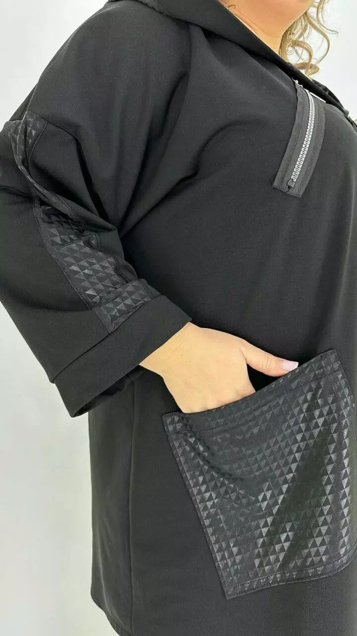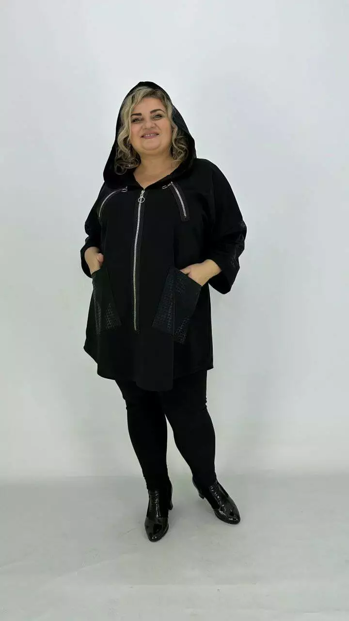 Туніка оверсайз з трикотажу двонитка з гарною розтяжністю, комбінована з біфлексом з лаковим напиленням, декоративні змійки. Вільний крій зі спущеним плечем підходить під будь-які груди. Розмір підбирати за обсягом стегон. Кишені накладні з капюшоном, рукав 5/6.