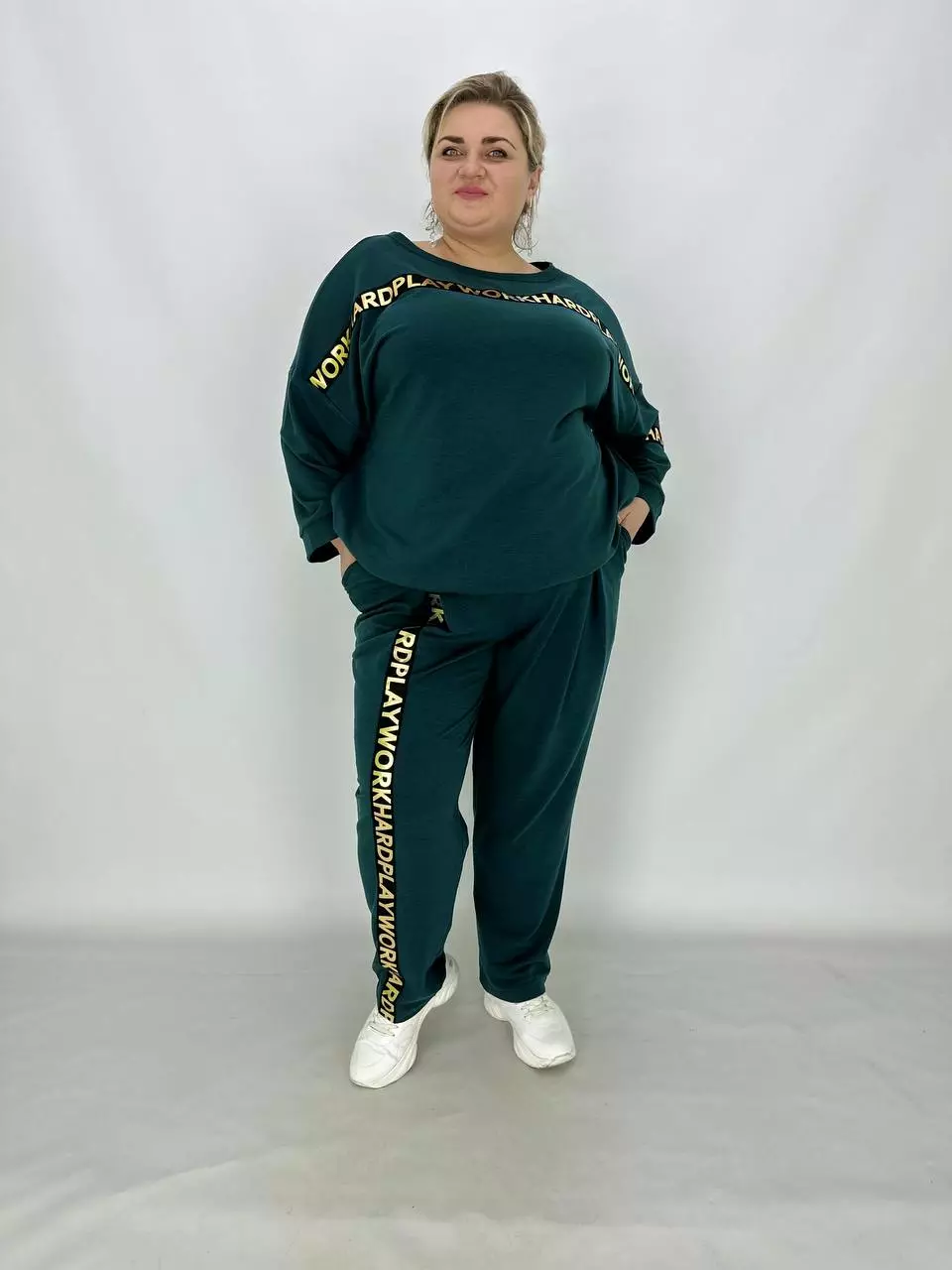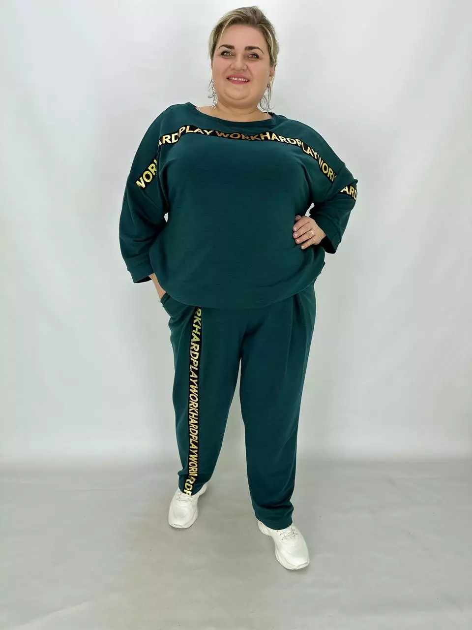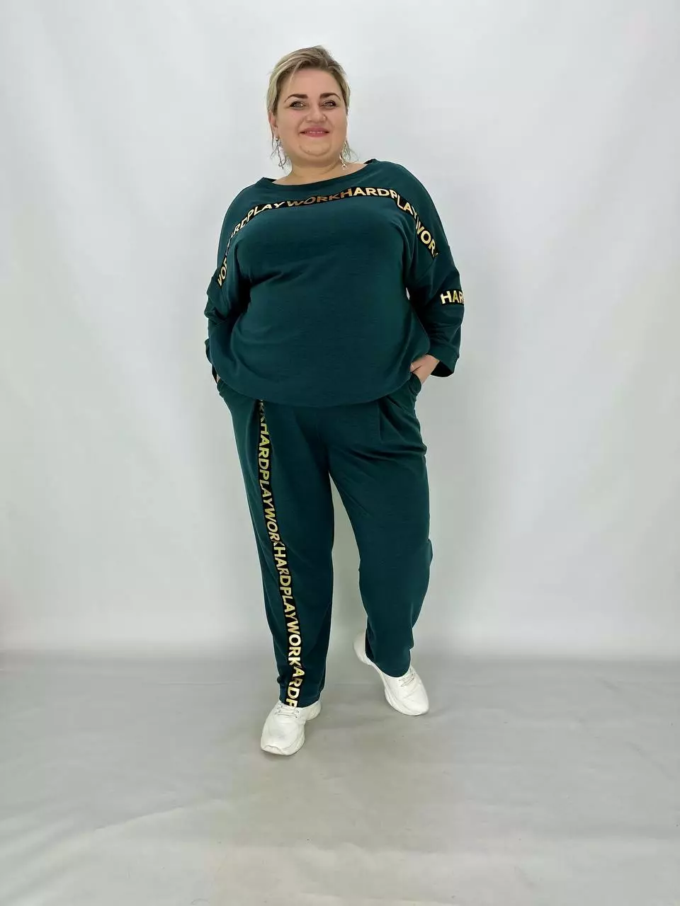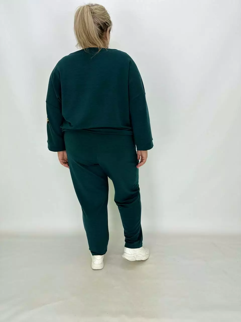 Прогулянковий костюм із двонитки, відмінної якості з гарною розтяжністю, прикрашений пришивною стрічкою з нанесенням з фольга. Кофта-вільний крій зі спущеним плечем, низ регулюється гумками з фіксатором, кишені в бічних швах, горловина човник. Штани-посадка висока, пояс на гумці, з кишенями, по переду закладені зустрічні складки, до низу звужені
