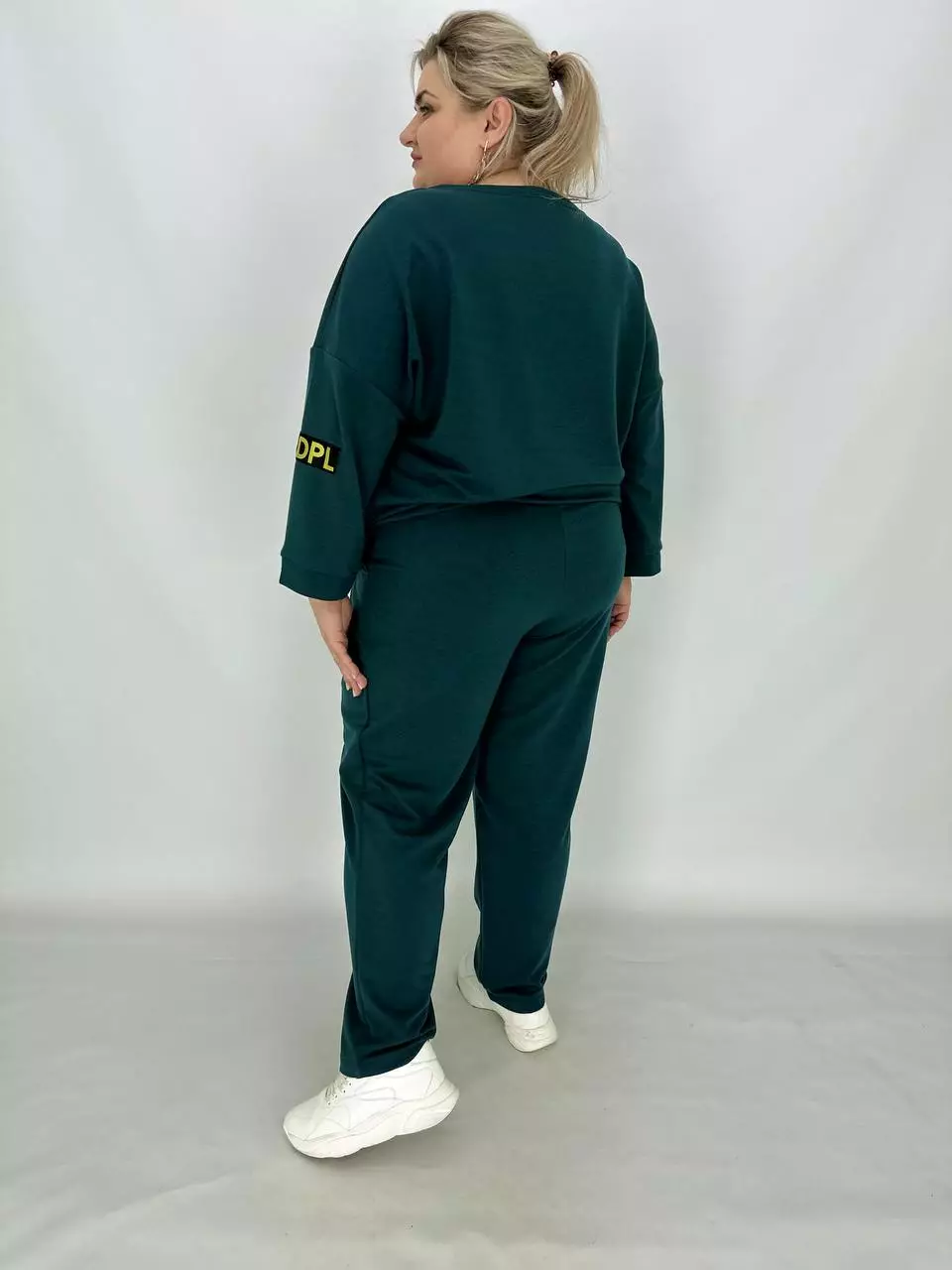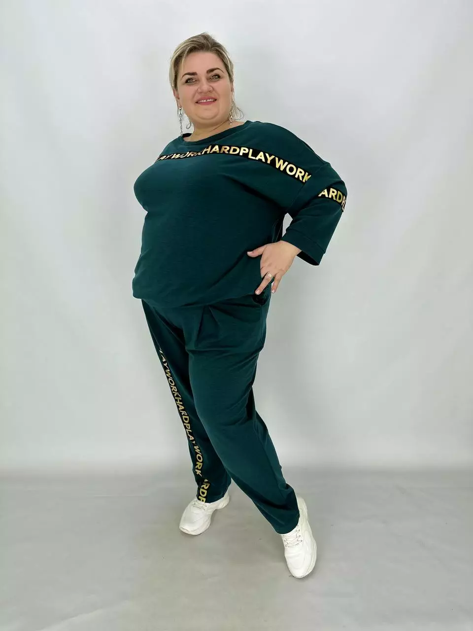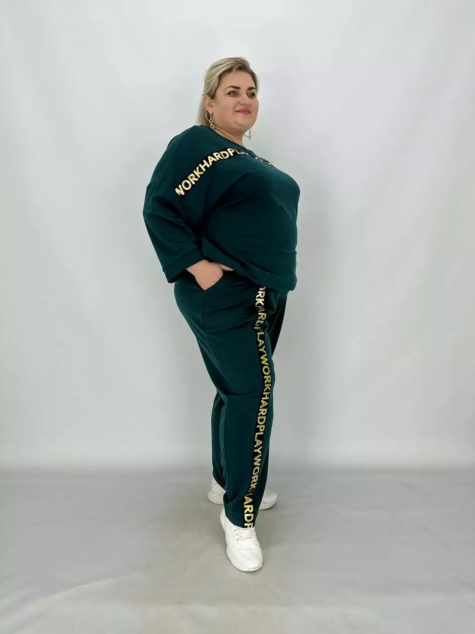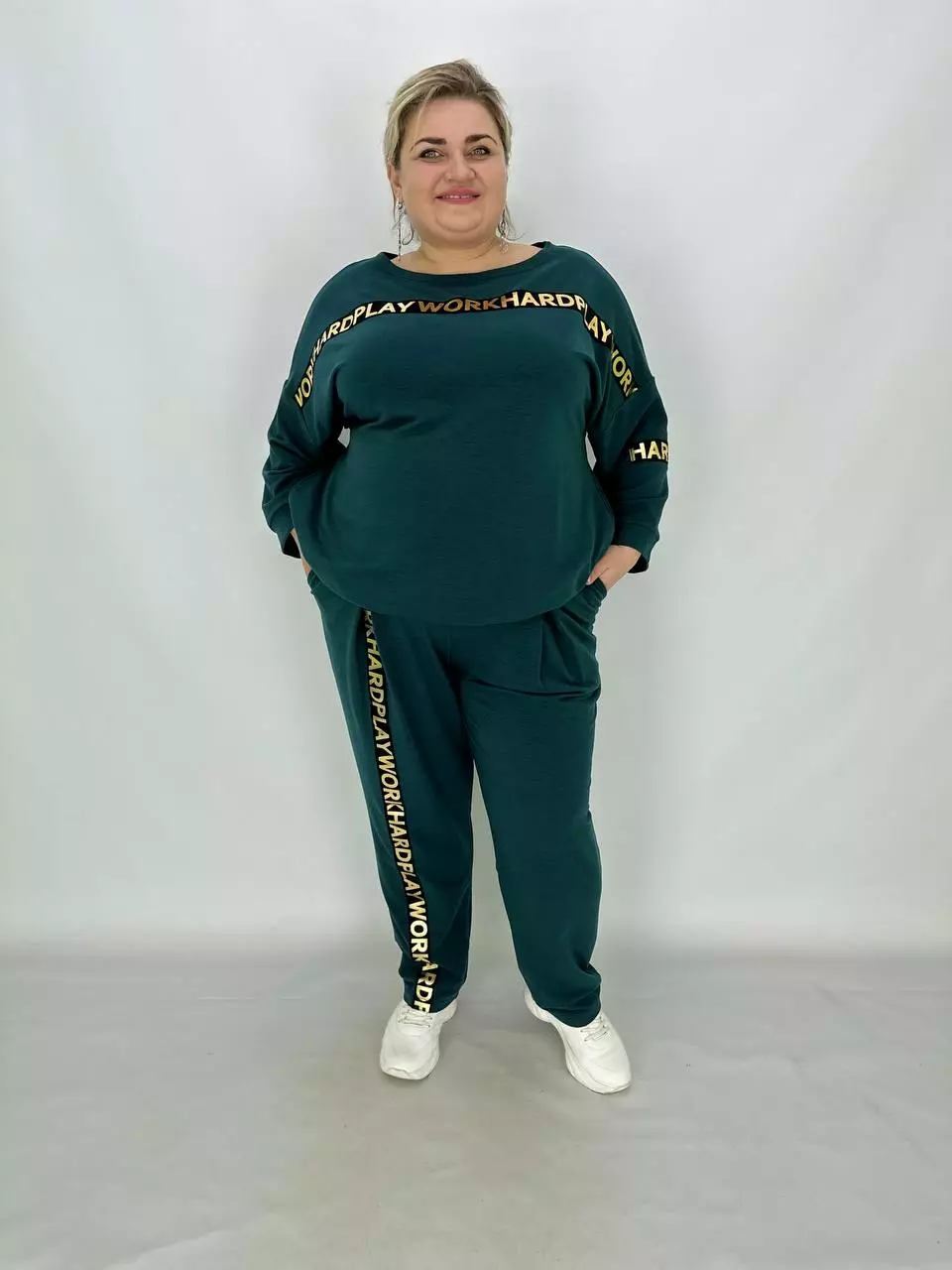 Прогулянковий костюм із двонитки, відмінної якості з гарною розтяжністю, прикрашений пришивною стрічкою з нанесенням з фольга. Кофта-вільний крій зі спущеним плечем, низ регулюється гумками з фіксатором, кишені в бічних швах, горловина човник. Штани-посадка висока, пояс на гумці, з кишенями, по переду закладені зустрічні складки, до низу звужені
