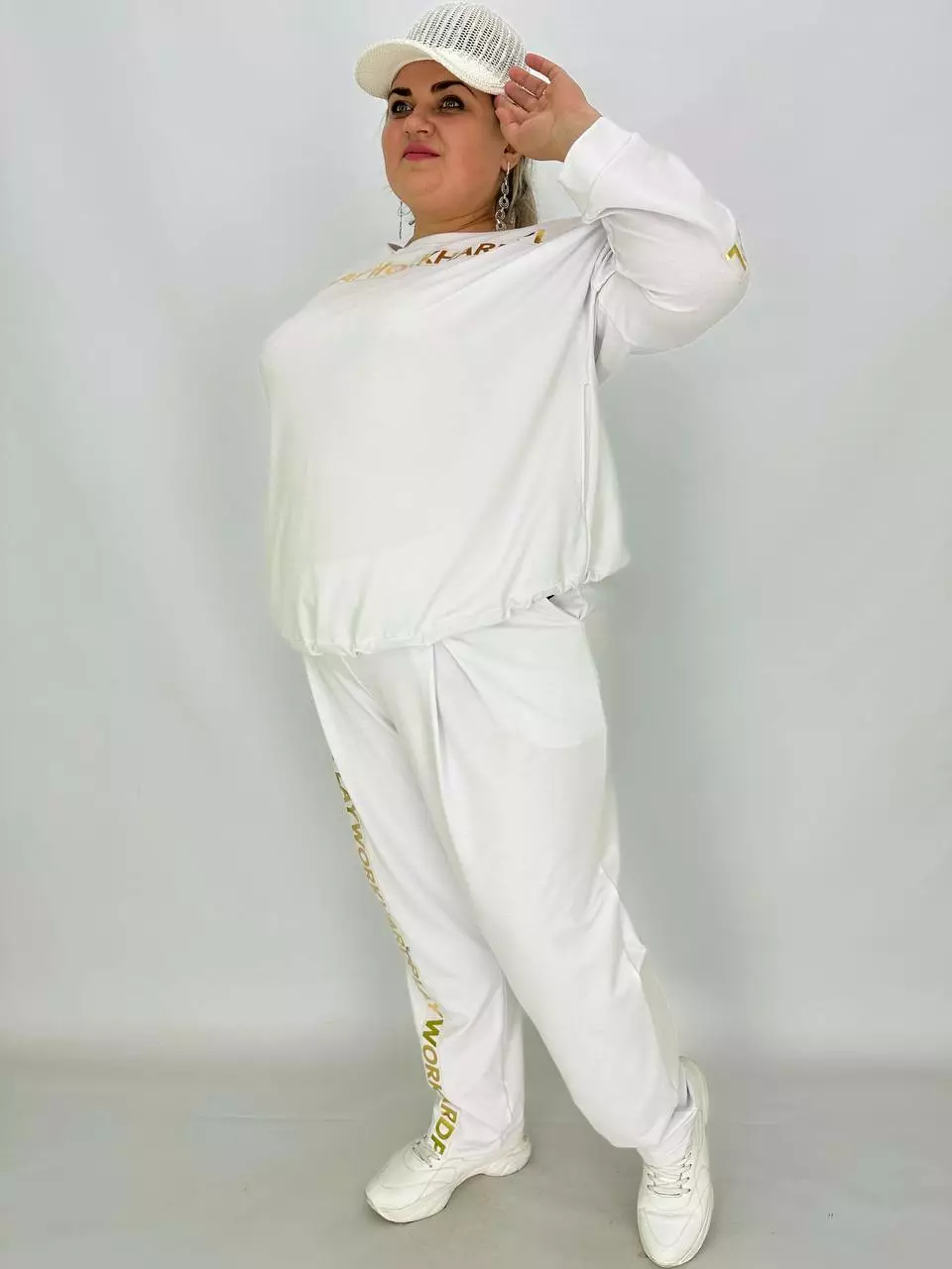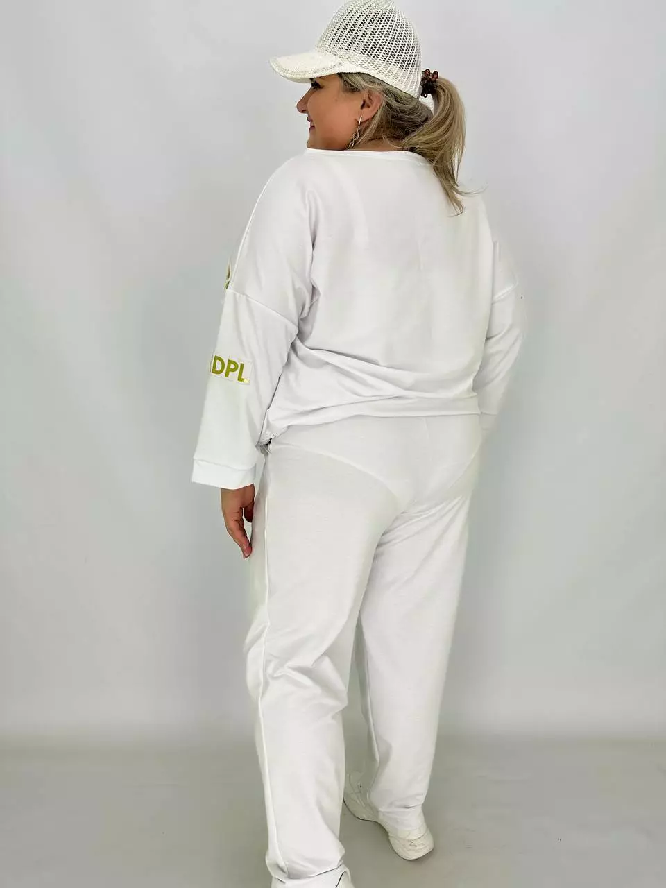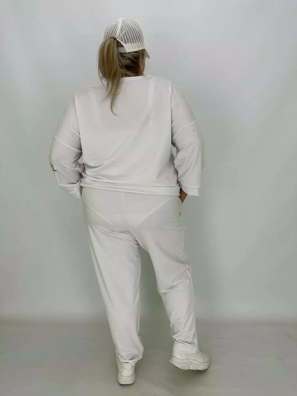 Прогулянковий костюм із двонитки, відмінної якості з гарною розтяжністю, прикрашений пришивною стрічкою з нанесенням з фольга. Кофта-вільний крій зі спущеним плечем, низ регулюється гумками з фіксатором, кишені в бічних швах, горловина човник. Штани-посадка висока, пояс на гумці, з кишенями, по переду закладені зустрічні складки, до низу звужені
