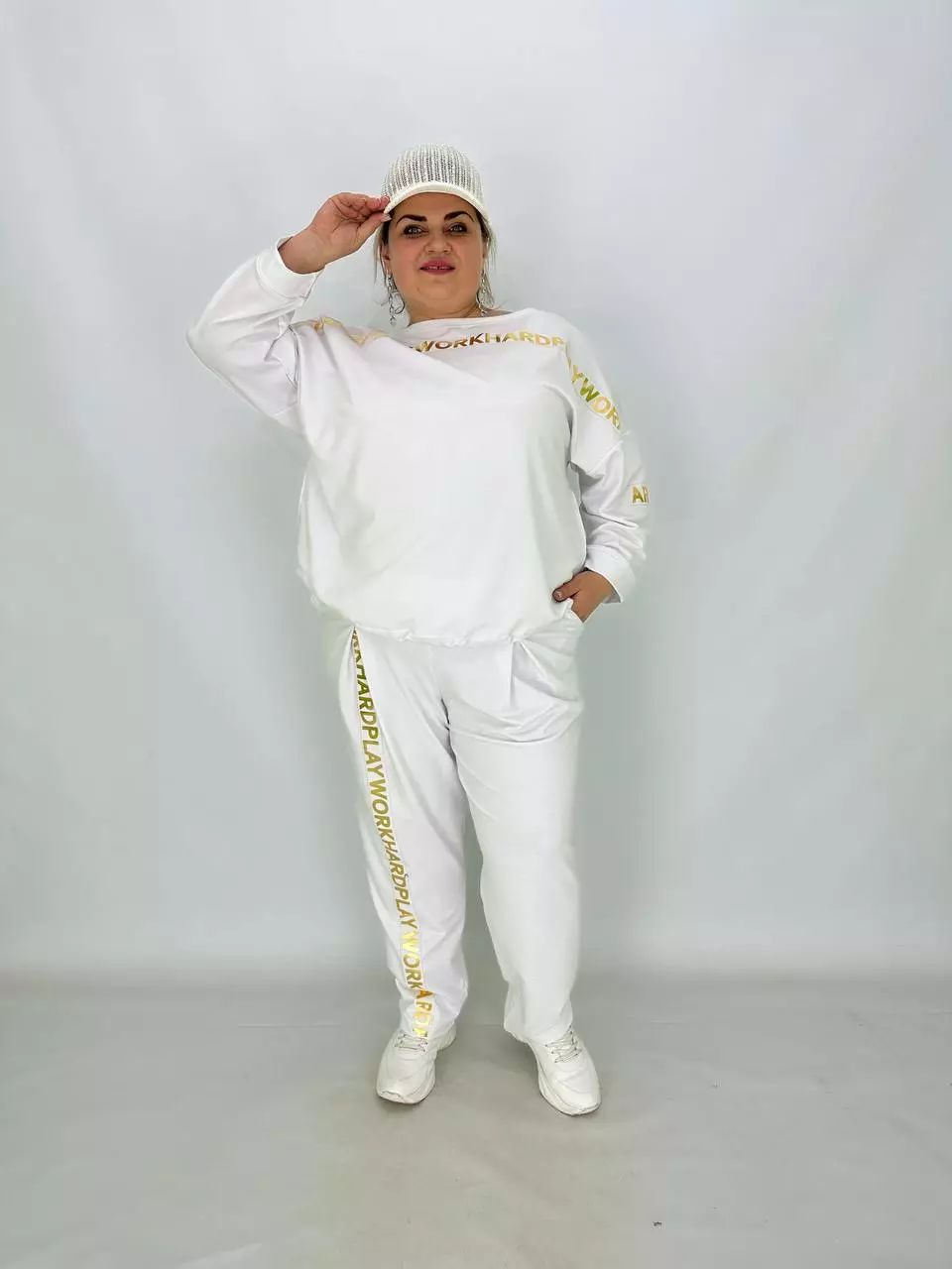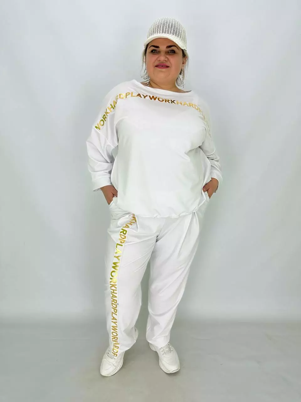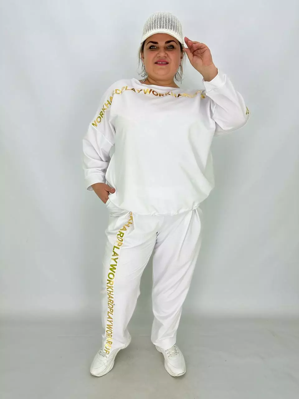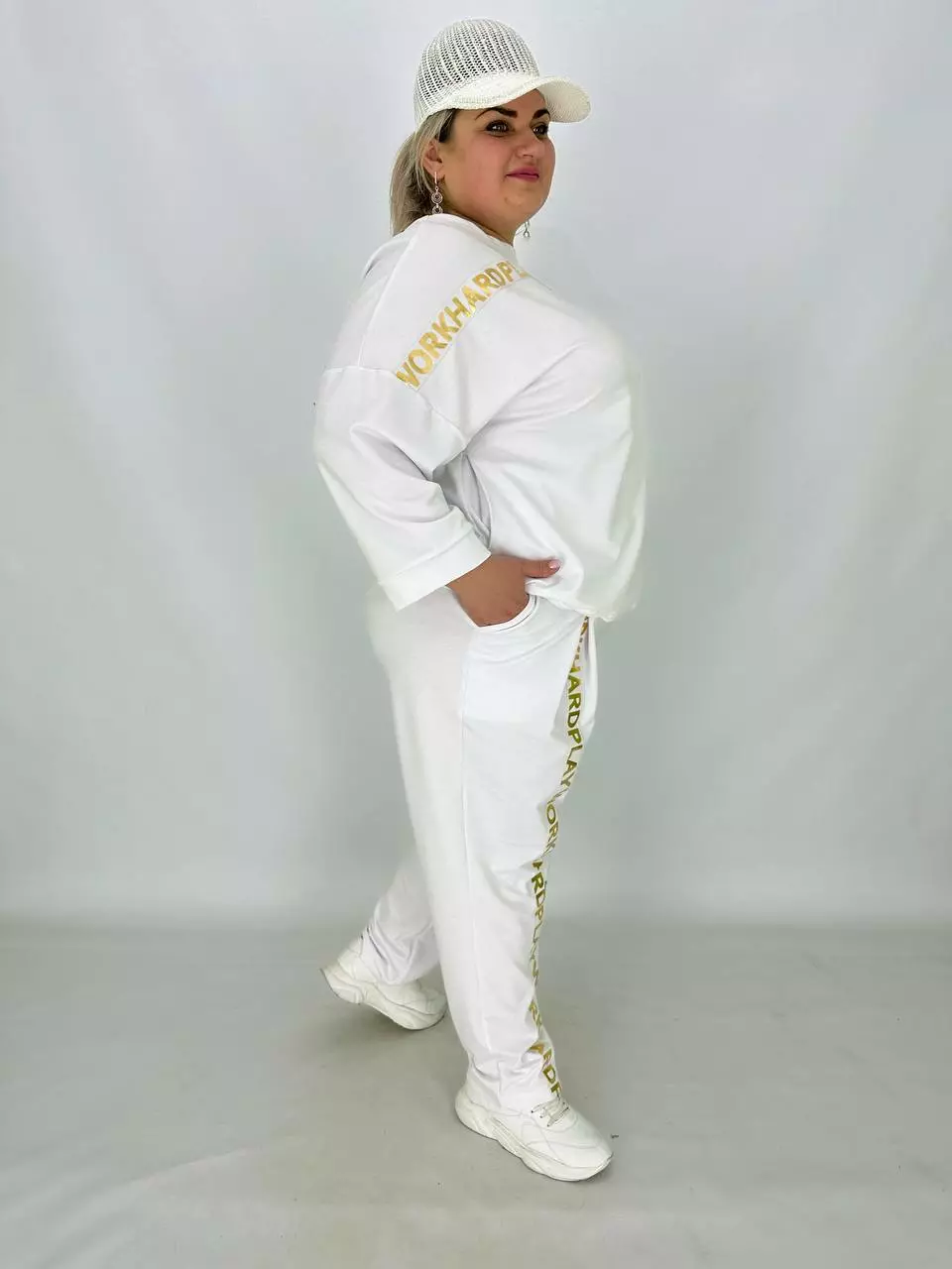 Прогулянковий костюм із двонитки, відмінної якості з гарною розтяжністю, прикрашений пришивною стрічкою з нанесенням з фольга. Кофта-вільний крій зі спущеним плечем, низ регулюється гумками з фіксатором, кишені в бічних швах, горловина човник. Штани-посадка висока, пояс на гумці, з кишенями, по переду закладені зустрічні складки, до низу звужені
