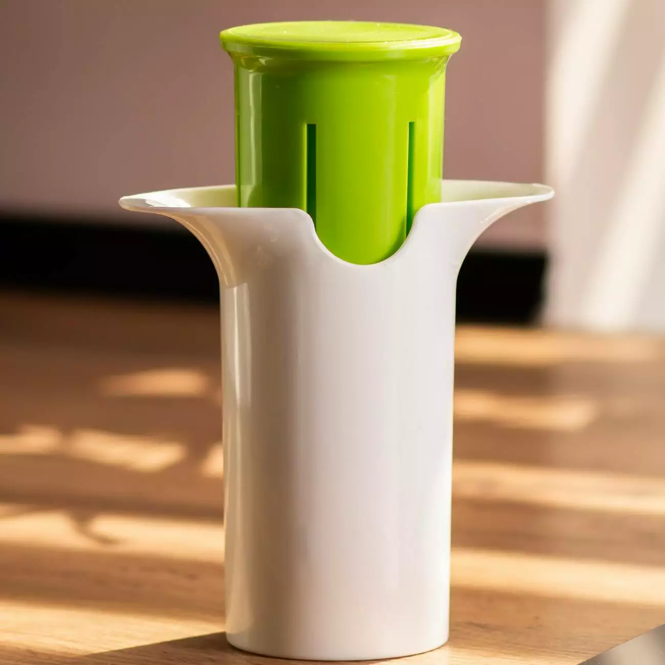 Овочерізка виготовлена з харчового пластику, всередині розташовані леза з нержавіючої сталі. Гаджет легко розбирається та миється, компактні розміри дозволяють знайти для неї місце в кухонній скриньці з приладдям.