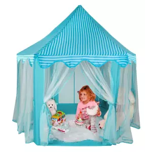 Тканевая палатка определенно является незаменимым компаньоном во время детских шалостей. Он имеет основание шестиугольника, имеет 6 входных отверстий и купол в форме пирамиды. Игрушка характеризуется привлекательным внешним видом. Синий цвет обшивки и полосы придают эстетические качества. Входы закрыты полупрозрачными белыми занавесками, которые отлично сочетаются с остальной частью палатки. Гардинки можно перевязать или драпировать различными способами с помощью декоративных тесемок. Используемое решение вместе с луками добавляет шарма, а также оживляет веселье.