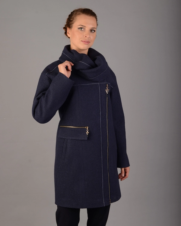 Демисезонное женское пальто. Материал - вареная шерсть. Свободный крой. Застежка молния. Два прорезных кармана, справа декоративный накладной на молнии. Воротник съемный, можно носить без него, тогда пальто становится особенно элегантным и стильным. Длина изделия - 85 см. Размерный ряд модели 44-54.